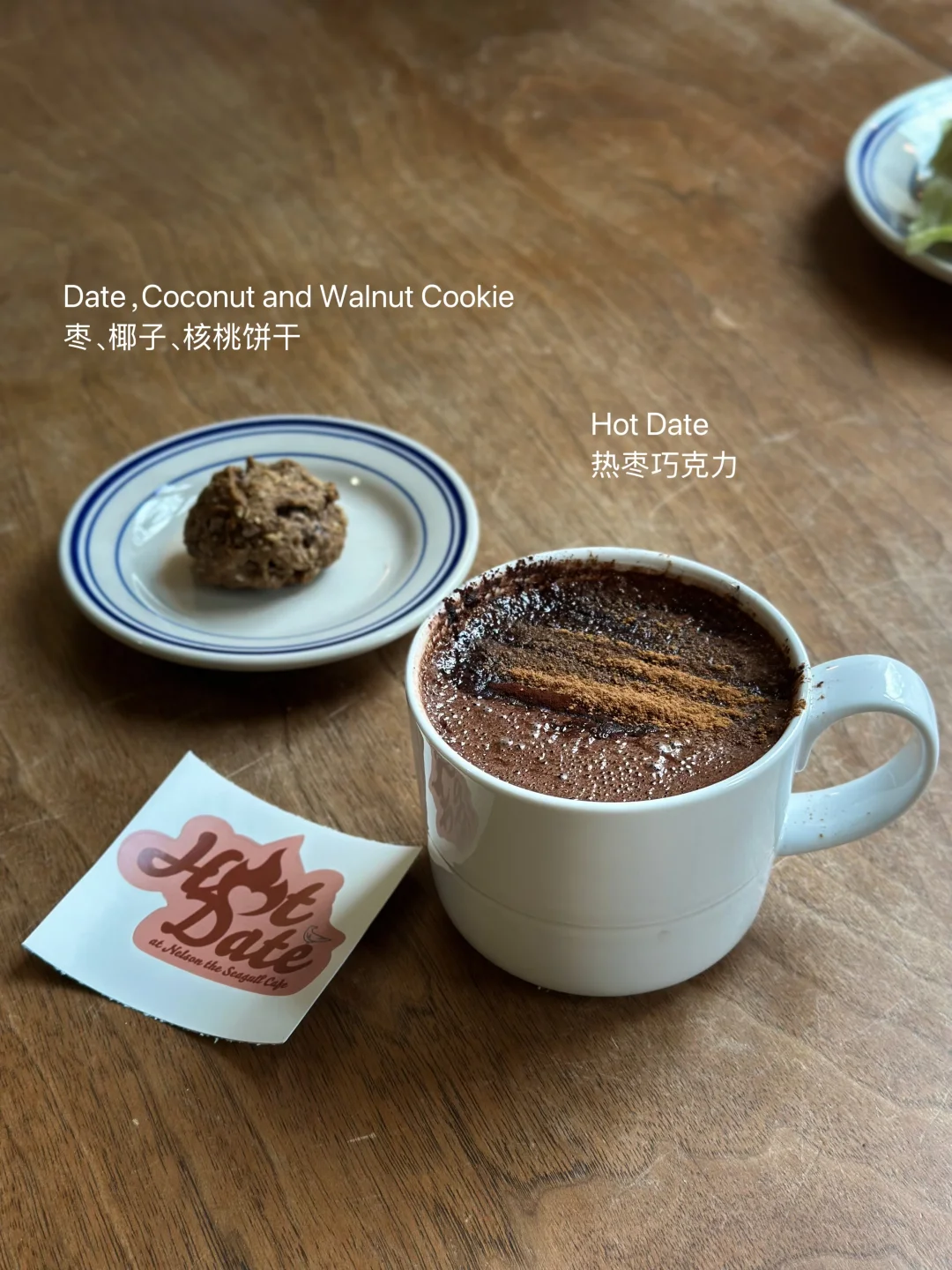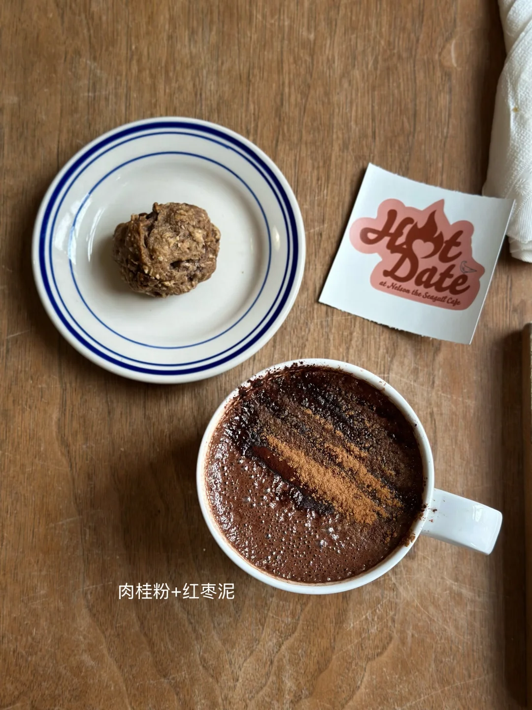 热枣是用枣泥做天然甜味剂,上面撒有肉桂粉,巧克力味很浓郁,配椰子和山核桃饼干