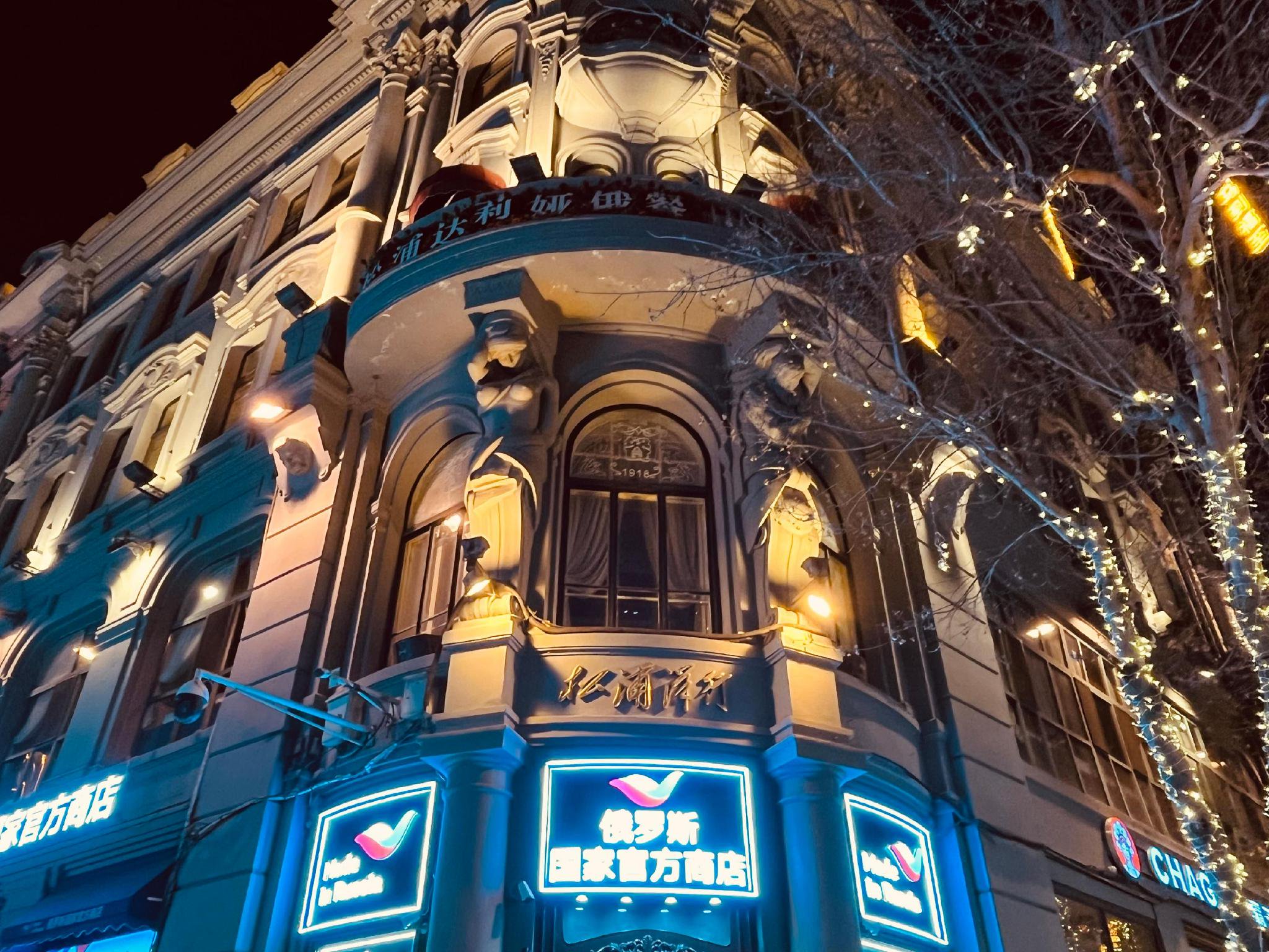 冬日夜晚的灯光打在斑驳的墙面上,那些精致的窗楣装饰、铸铁的围栏、墙角的浮雕,沉默地背负着一个多世纪前的繁华。