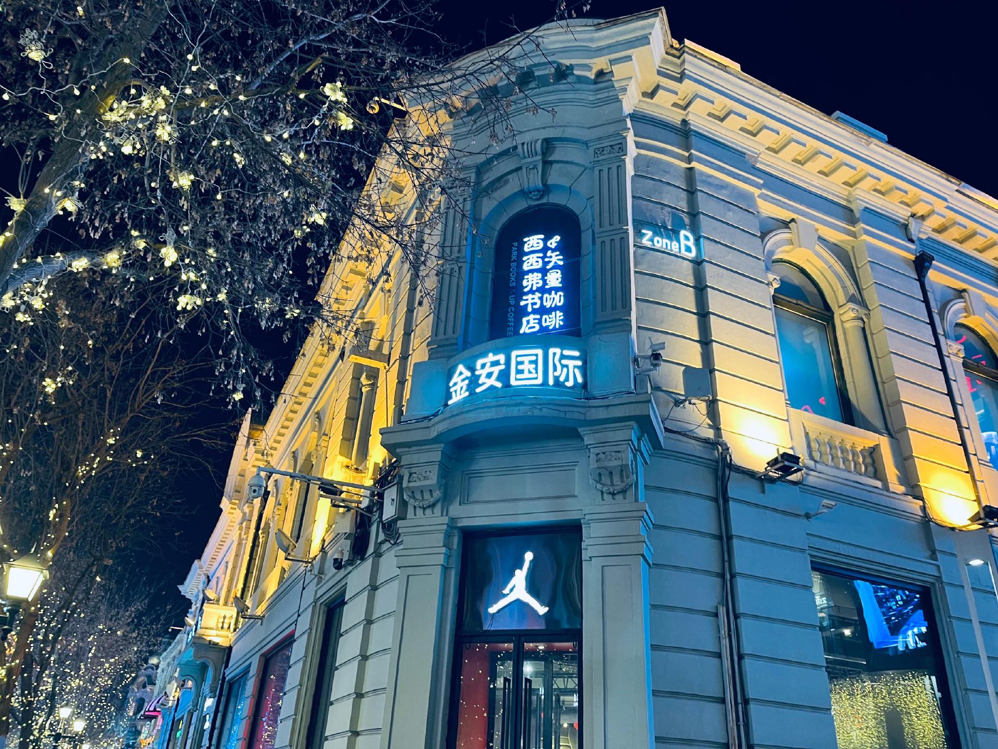 中央大街73号,一座黄白相间的二层小楼,如今挂上了“金安国际”大楼的门牌。门口的招牌上还挂着书店、咖啡店的LOGO,橱窗里灯火通明。