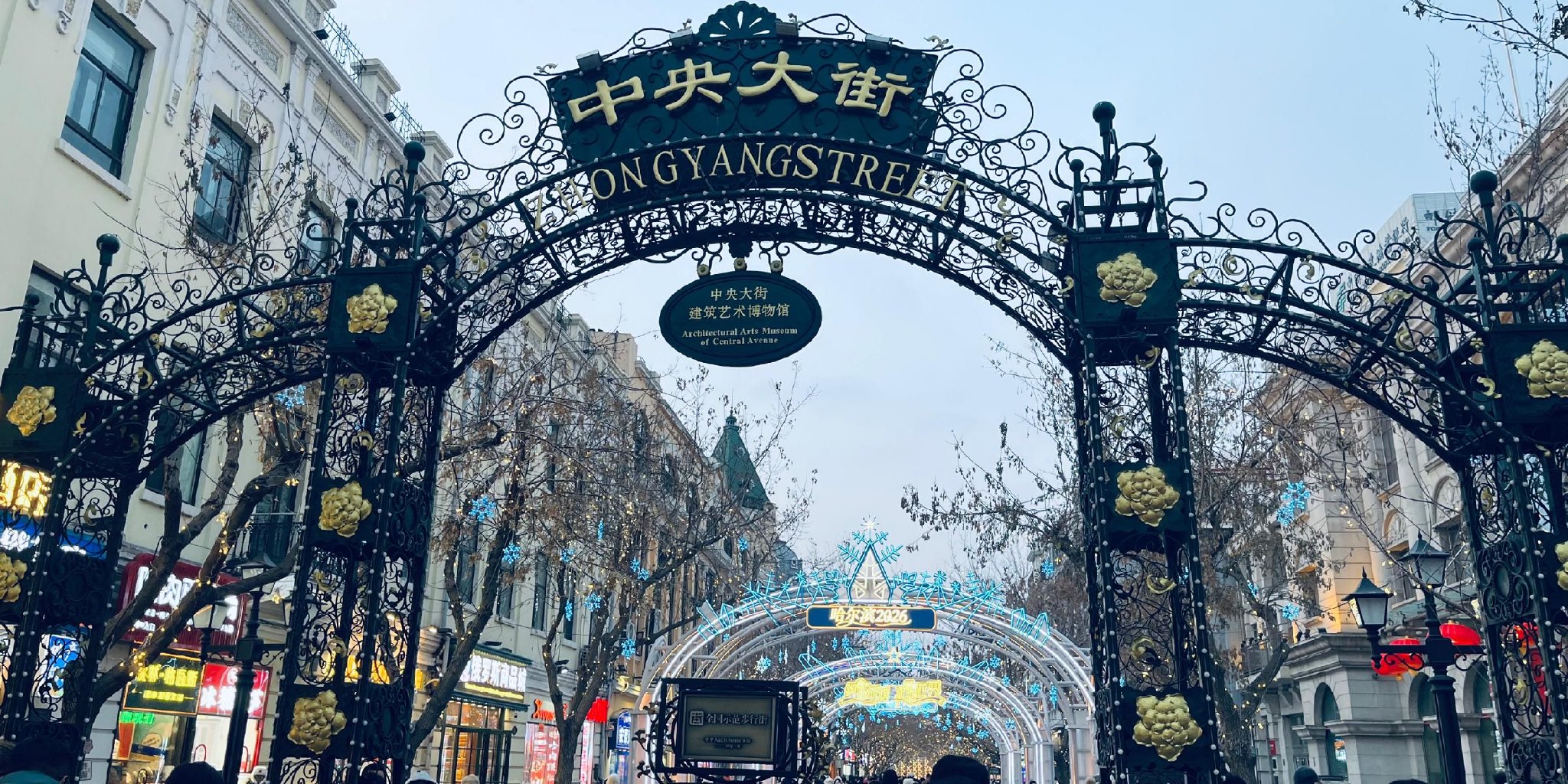 一千四百五十米长的哈尔滨中央大街上,游人摩肩接踵。