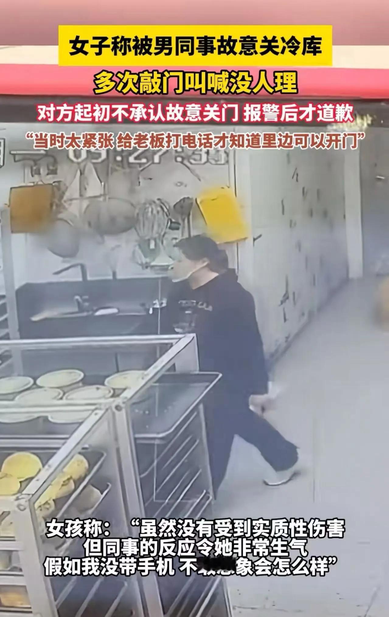 2025年4月,广东一女子被男同事故意关冷库里,期间多次大声喊叫敲门,男同事都当没听到并在外面笑,女子急忙给老板拨打电话,得知里面可以开门后,女子就走出冷库,她质问男同事时,对方竟然不承认故意关门,一气之下女子选择报警,网友:身边的人满怀恶意! 这事发生在广东揭阳的一家店里,当时天气已经不算冷,但冷库里面的温度低得吓人,关上门之后更是又黑又闷,隔音还特别好。 女子被关进去之后,心里一下子就慌了,赶紧使劲拍门,扯着嗓子喊人,希望外面的同事能听见赶紧开门。 可她喊了半天,手都拍疼了,门外不仅没人回应,还能隐约听到男同事们的哄笑声,那种感觉又无助又心寒。 她知道光喊没用,赶紧摸出手机给老板打电话,声音都带着哭腔,说自己被关在冷库里出不去了。 老板在电话里一着急,才吼着告诉她,冷库里面有个紧急按钮,按一下门就能开。 女子这才在冰冷的墙壁上摸索,好不容易找到那个红色按钮,按下去之后门果然开了,她赶紧跑出来,浑身都冻得发抖,脸色苍白得吓人。 出来之后,她第一时间找到那个男同事,问他为什么要故意把自己关进去,可没想到,对方竟然一脸无辜,说自己不是故意的,还反过来觉得她小题大做。 这种明明做错了还不承认的态度,让女子越想越气,之前在冷库里的恐惧和委屈一下子涌上来,当场就选择了报警。 民警过来之后,调取了店里的监控,画面看得明明白白。 那个男同事先是探头确认女子在冷库里面,然后毫不犹豫地反手关上门,还捂着嘴偷偷笑了笑,之后就小跑着离开了,全程没有一点迟疑。 监控拍得清清楚楚,所谓的“不是故意”根本站不住脚,那些门外的哄笑声,也说明其他在场的同事不仅没阻止,还把这事当成了看热闹的乐子。 后来警方介入调解,男同事没办法,只能道歉赔偿,女子想着还要继续生活,也不想把事情闹得太僵,就签了和解协议。可这事传到网上之后,还是让很多人觉得不舒服。 大家不是非要揪着不放,而是觉得这种行为太过分了,冷库是高危场所,里面又冷又容易缺氧,要是女子手机没电,或者没找到紧急按钮,后果真的不堪设想。 更让人心里发寒的是,这根本不是什么意外,而是带着恶意的“玩笑”。 那个男同事明明知道关在里面有多危险,却还是这么做,就为了看别人惊慌失措的样子,甚至还觉得自己很有趣。 而那些旁观者,明明听到了求救声,却选择视而不见,跟着一起笑,这种冷漠比单独的恶意更让人难受。 网友说“身边的人满怀恶意”,其实不是说身边都是坏人,而是这种藏在日常里的坏太让人防不胜防。 可能平时看着关系还行的同事,心里却藏着见不得别人好的阴暗,把别人的恐惧当成自己的乐子。 而且那家店也有问题,冷库的紧急按钮,员工天天进出竟然都不知道,平时的安全培训根本没做到位,这要是真出了大事,谁也担不起责任。 现在这事过去大半年了,当事人可能已经慢慢放下,但留给大家的警醒还在。 所谓的玩笑,前提是双方都觉得开心,要是让别人陷入恐惧和危险,那就不是玩笑,而是霸凌,甚至是犯罪。 职场本来是大家一起工作赚钱的地方,互相体谅、互相帮忙才对,怎么能把别人的安危当儿戏呢? 大家对此怎么看?欢迎评论区留下您的观点!