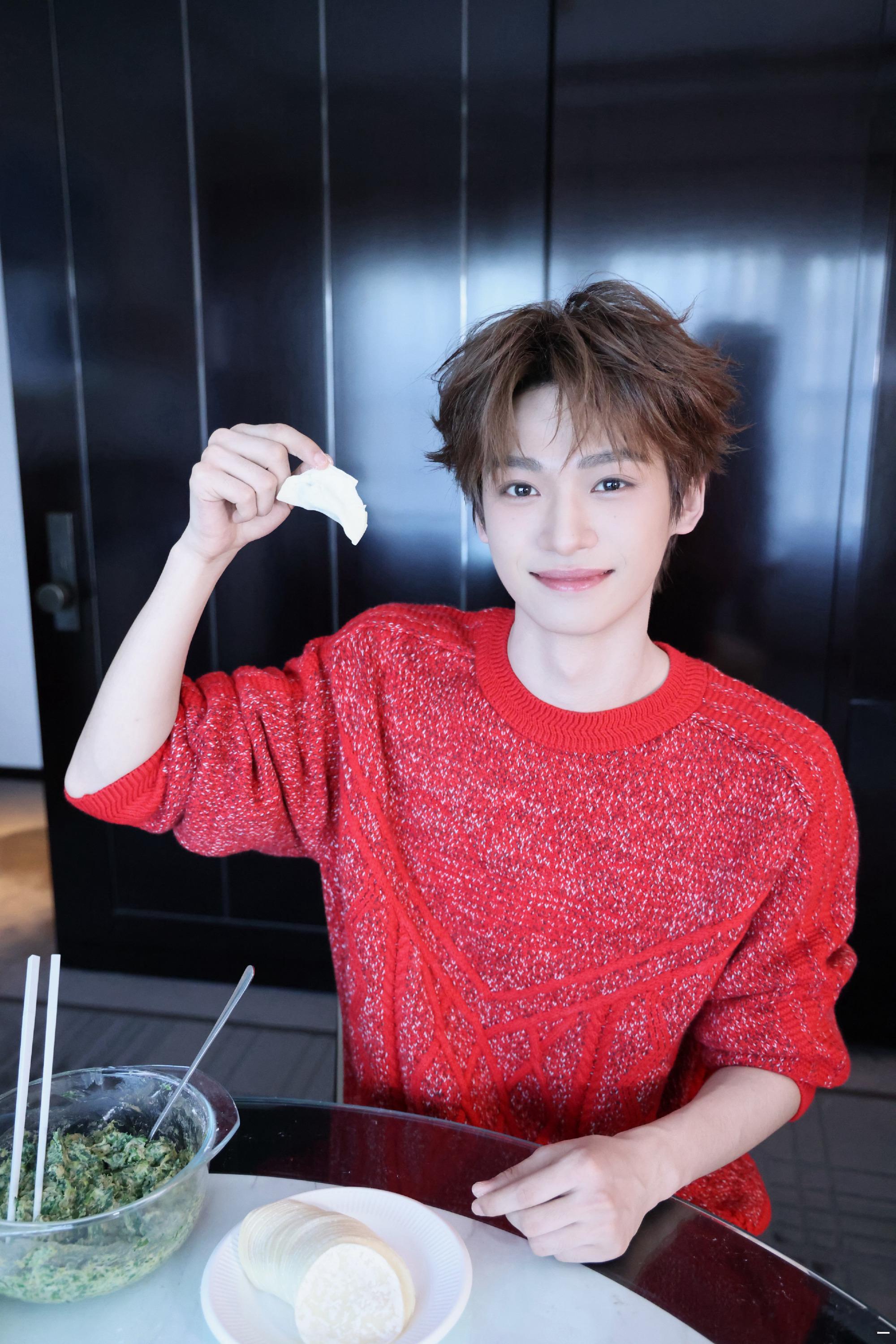 梓渝祝除夕快乐梓渝说荠菜饺子好吃 梓渝晒年味十足的照片啦,穿着红衣包荠菜馅饺子,