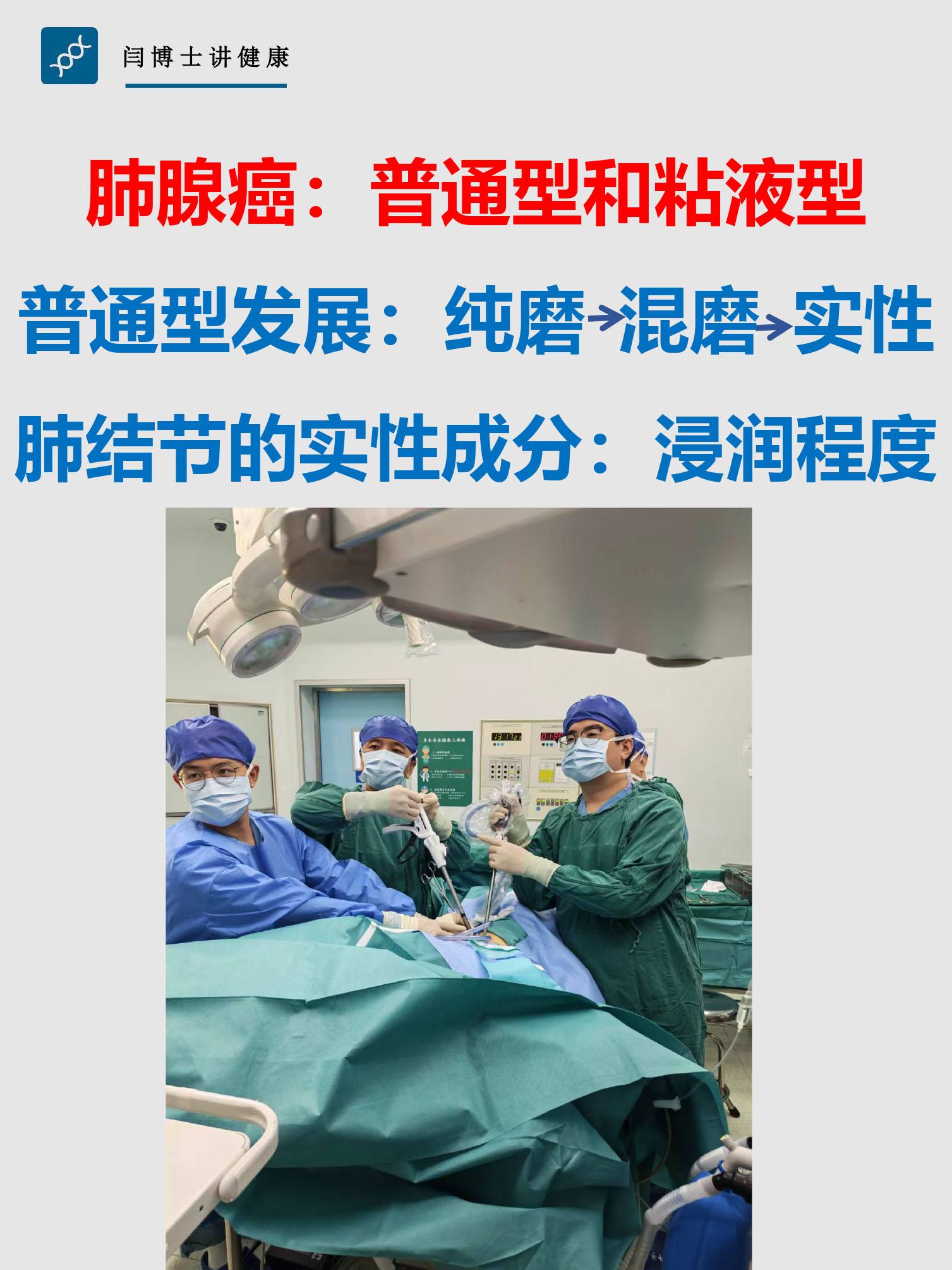 肺恶性结节多数属于肺腺癌。肺腺癌最常见的病理类型是普通型腺癌,少部分为粘液型腺癌。普通型腺癌一般先以纯磨玻璃出现,随着病变的发展,出现实性成分,实性成分一般代表浸润情况。