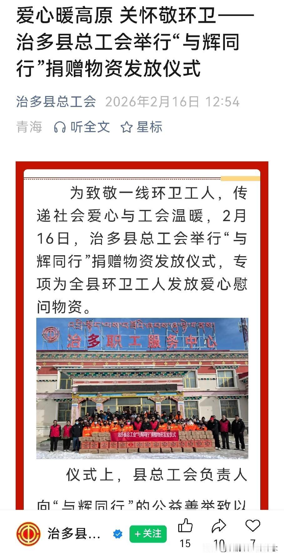 除夕夜,“与辉同行”公益行的步伐到达了青海省玉树州治多县!这个治多县,正是电视剧《生命树》故事原型的发生地。 从《生命树》里守护可可西里的热血故事,到今天“与辉同行”对治多县的公益捐赠,既是对高原一线环卫工人的致敬,也像是一次对《生命树》所代表的守护精神的呼应与传承。 同样是治多县,同样是守护与奉献。有人用生命守护这片土地的生态,有人用行动温暖这片土地的守护者。 愿这份温暖,能像高原的阳光一样,一直照在每个人的心上。 董宇辉 与辉同行