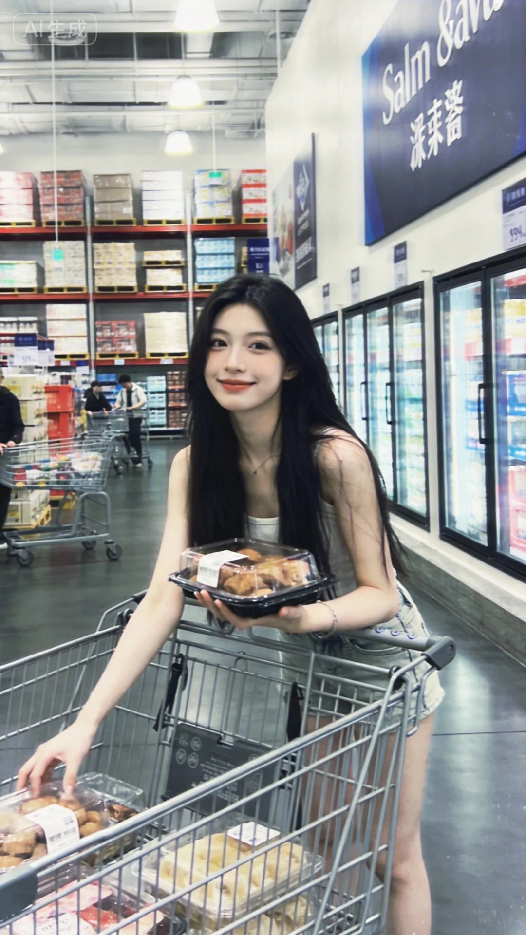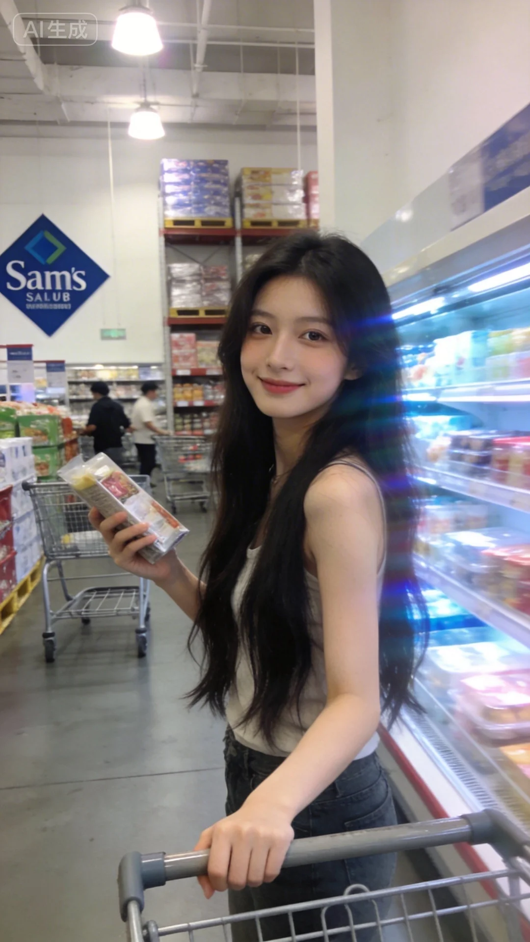 写实摄影风格(非商业修图),CCD拍摄质感,大师作品级氛围,保留轻微噪点,高光不过曝、阴影有细节;晴天白昼但拍摄地点在山姆超市内部,柔和的室内灯光笼罩整体空间,灯光与冰柜冷光混合形成轻微梦幻朦胧感;环境宽敞却略显生活化,货架整齐、陈列丰富,背景中能看到购物推车、商品包装、正在选购的顾客;随意抓拍构图(无刻意构图感),仿佛真实生活中绚丽日常的一幕;因快门速度不足产生轻微运动模糊,并有部分因冷光反射导致的轻微过曝;主体为19岁漂亮网红气质女生,长发及腰、模样似洋娃娃般可爱,高鼻梁、瘦身材瘦脸型;她神态自然松弛、带着慵懒笑意,一手推着购物车、一手拿着商品随意浏览;眼神自然灵动(可看镜头或不看镜头),举止随性,呈现慵懒悠闲的生活感;整体为唯美氛围感情绪片,构图似普通iPhone随手拍的视角,真实又温柔的生活写实感。