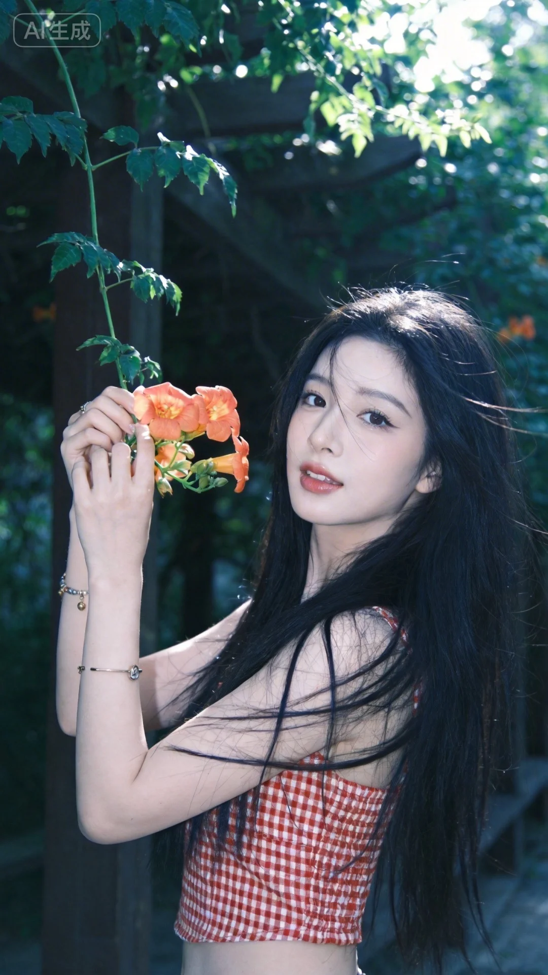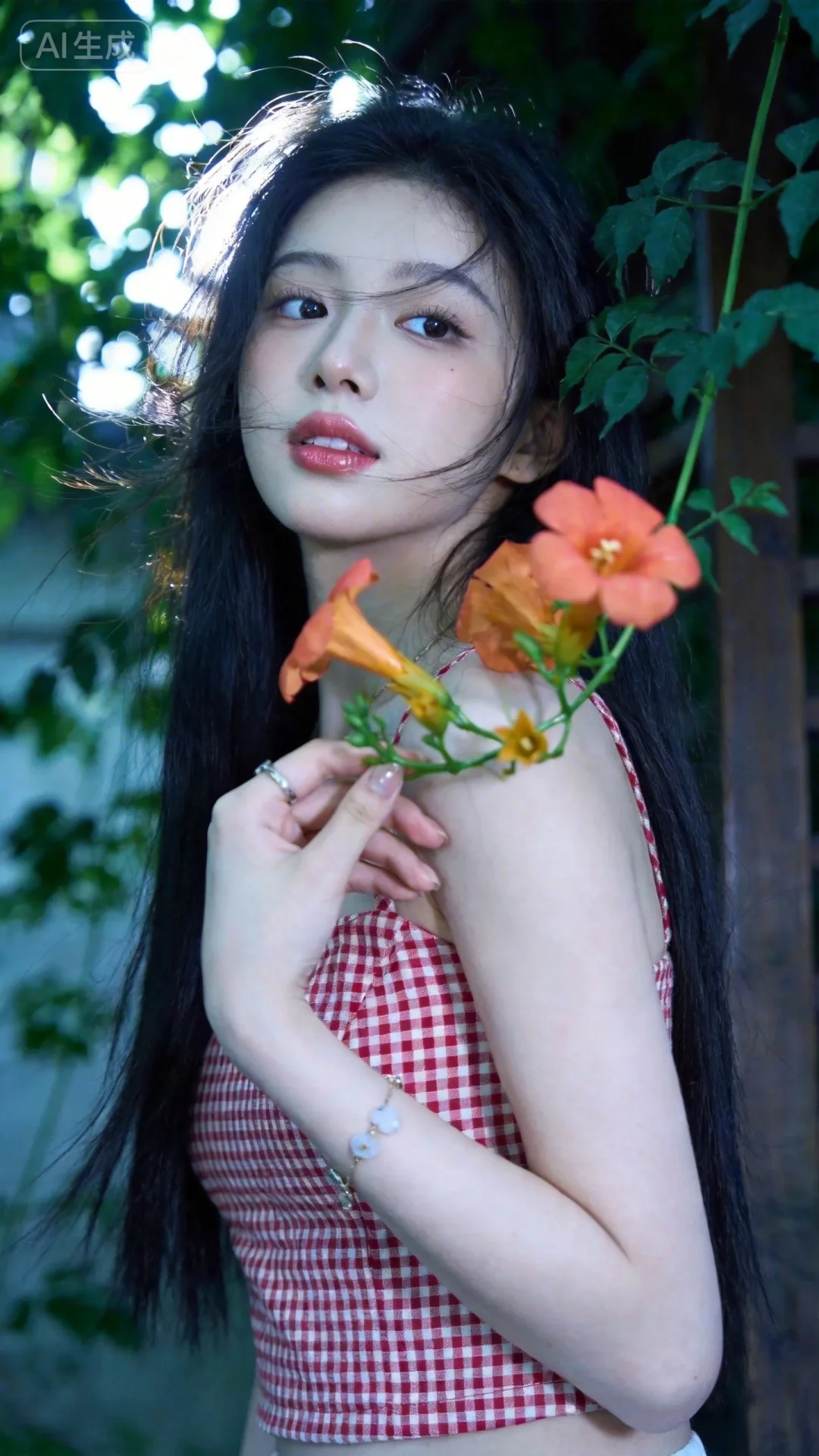 真实摄影,穿着红白色格纹上衣,手持带有橙色花朵的绿色枝条,侧身站立于绿意盎然的户外环境中(周围有茂密的绿叶与木质结构),阳光透过枝叶形成光斑,整体风格清新、自然,充满春日户外的活力氛围感,(电影级面光:1.6),(光线追踪:1.5),(冷白皮漫感质感的光滑皮肤:1.7),(人物有最好的骨相:1.2),(网感脸:1.6),(网感妆:1.6)身材完美,莫兰迪配色,高颜值网红,INS风,幼态脸,19岁女生尖下巴,三庭五眼比例均衡,身材娇小,细腻陶瓷水嫩肌肤,偏冷白皮,随机的妆容,随机的饰品,随机的动作,侧光,发丝轻飘,凌乱,随机角度拍摄,总体有很多的不确定性,但又好看,