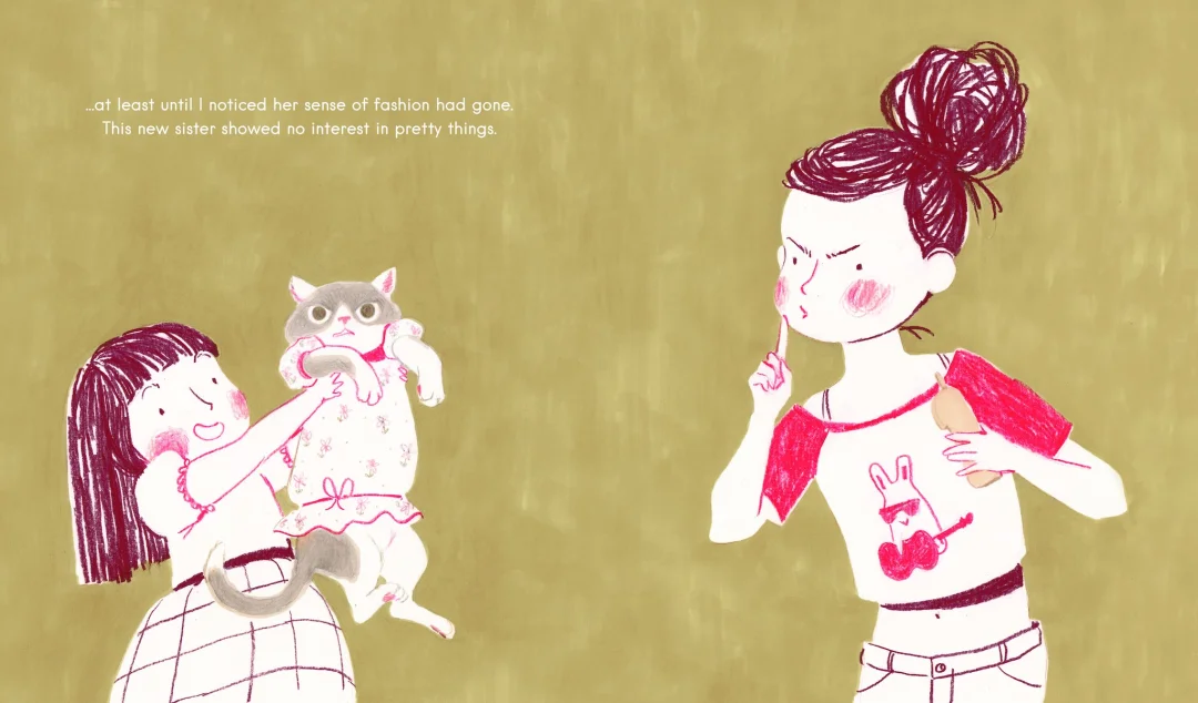 以前的姐姐会陪小女孩玩、会一起帮小猫装扮;现在的姐姐总是关在房里,除了,不再懂时尚,而且变得喜欢和男孩子在一起……