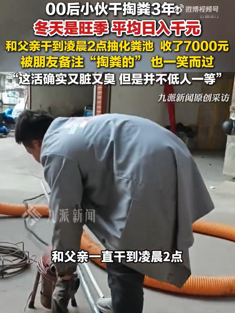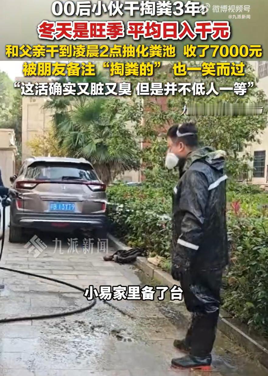 真香警告!江西赣州,一名00后小伙干了3年掏粪工,不少朋友得知后,甚至直接给他备注掏粪的。可小伙毫不在意,因为他平均日收入千元,有时候一天甚至有7000。网友:还招人吗?我不在意别人备注 小易是2000年出生的,他原来开网约车,拼死拼活一天也就三四百块。表哥带他入行那天,他其实心里是拒绝的,00后嘛,谁愿意跟粪坑打交道? 结果第一天干下来,大大小小的活收了三千多。这数字直接把他干沉默了。后来他贷款买了清污车,专职干这行 现在冬天是旺季,去年除夕下午四点接了个急单,一直干到凌晨两点,足足抽了6车,但收了差不多七千块。过年?不存在的,越到年根越忙。对于他来说,这份工作虽脏、累,但从来没觉得自己低人一等 有些人可能会觉得这份工作不光鲜,甚至会因此瞧不起。但小易对此从来不在意,哪怕朋友们给他起外号,通讯录里备注“掏粪的”,他也只是笑笑。因为他知道,做这行的收入不低,甚至比很多“看似体面”的工作都要来得高 当然,也不是谁都能干这个。除了要克服心理障碍,还得有体力,能吃苦。他除夕干到凌晨两点,这种时候大多数人都在家吃团圆饭。任何高收入的背后,都有外人看不到的付出