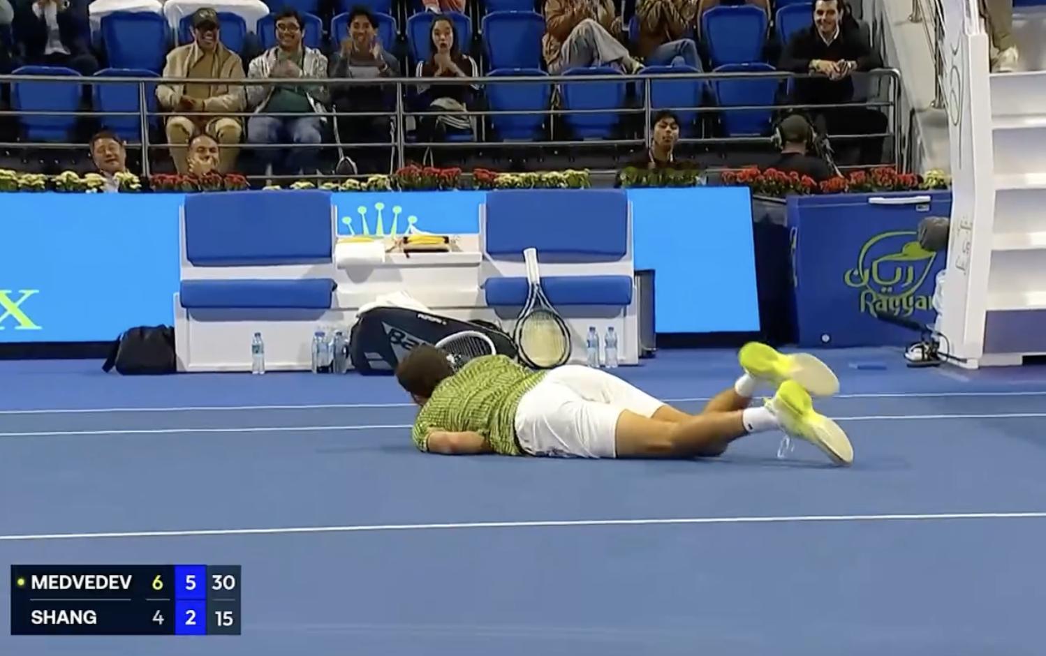 多哈赛首轮,商竣程4-6/2-6被梅德韦杰夫淘汰,最后时刻双方都打趴了今天中国队