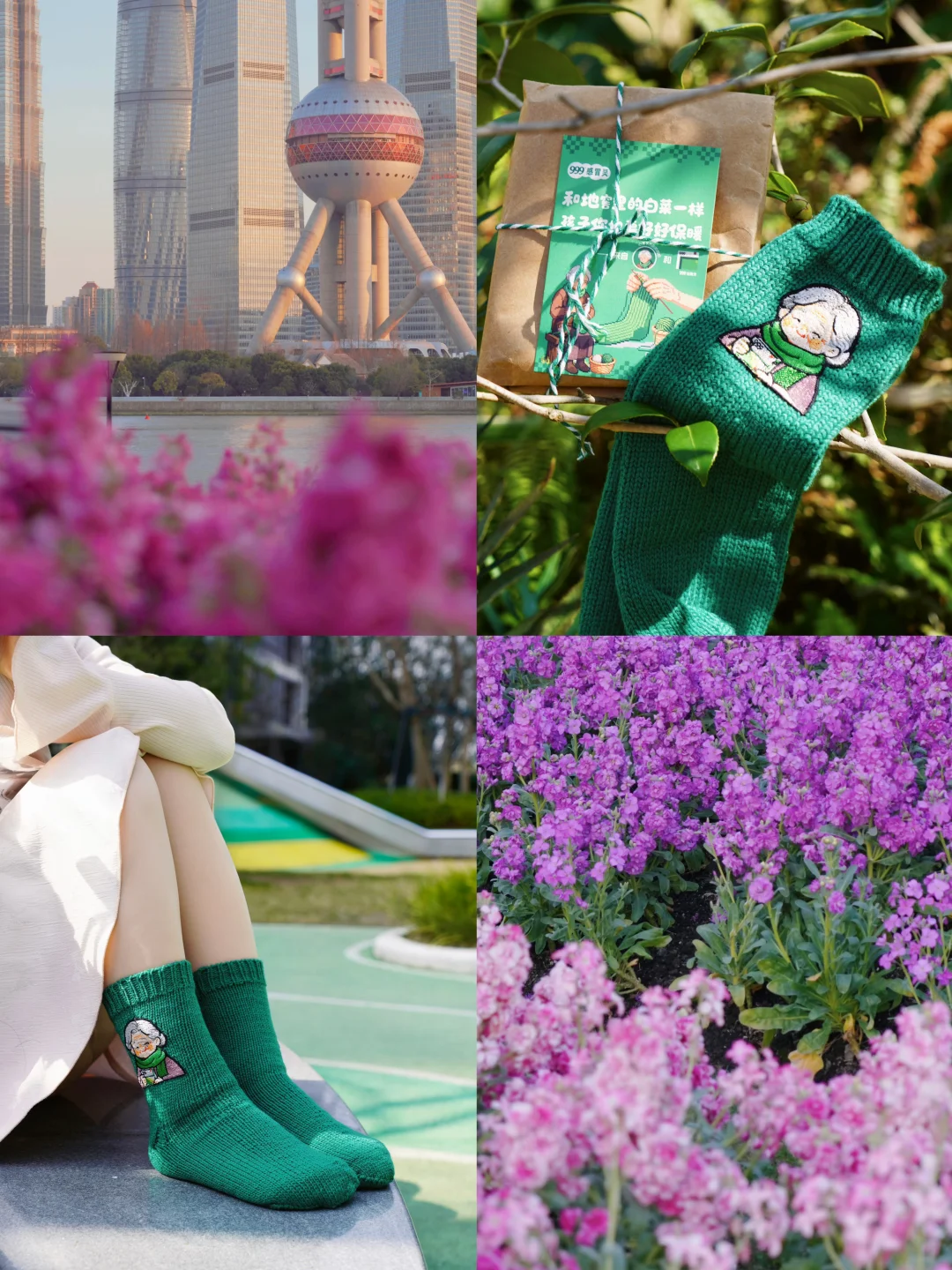 ❸江边风大,注意保暖。今天穿了双999感冒灵的"奶奶牌"手织袜去赏花——这不是普通的品牌周边,而是一场跨越代际的温暖共创