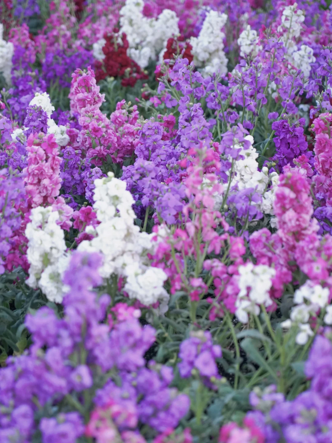 白色、粉色、淡紫色的花朵交织成一片缤纷花海
