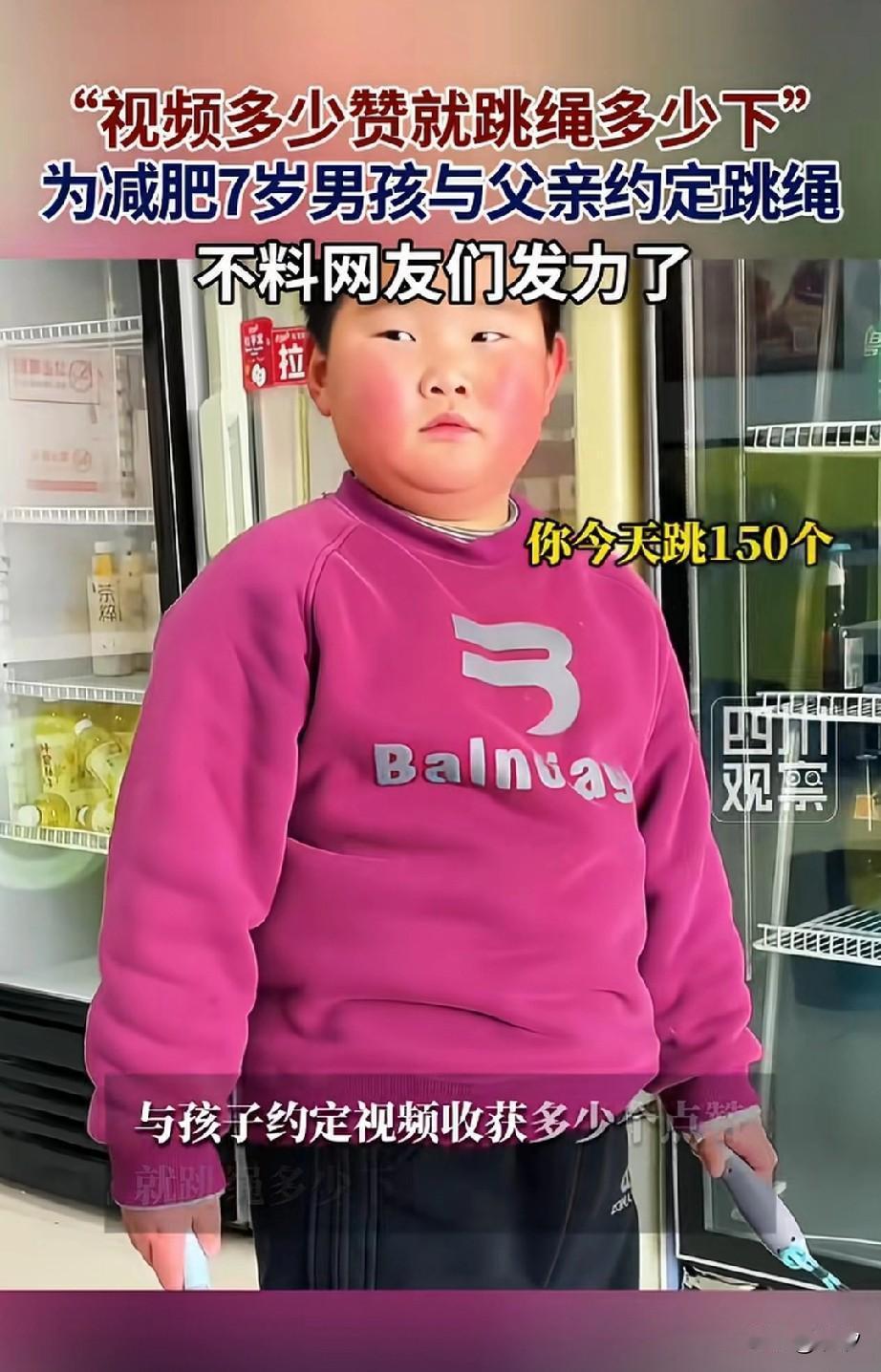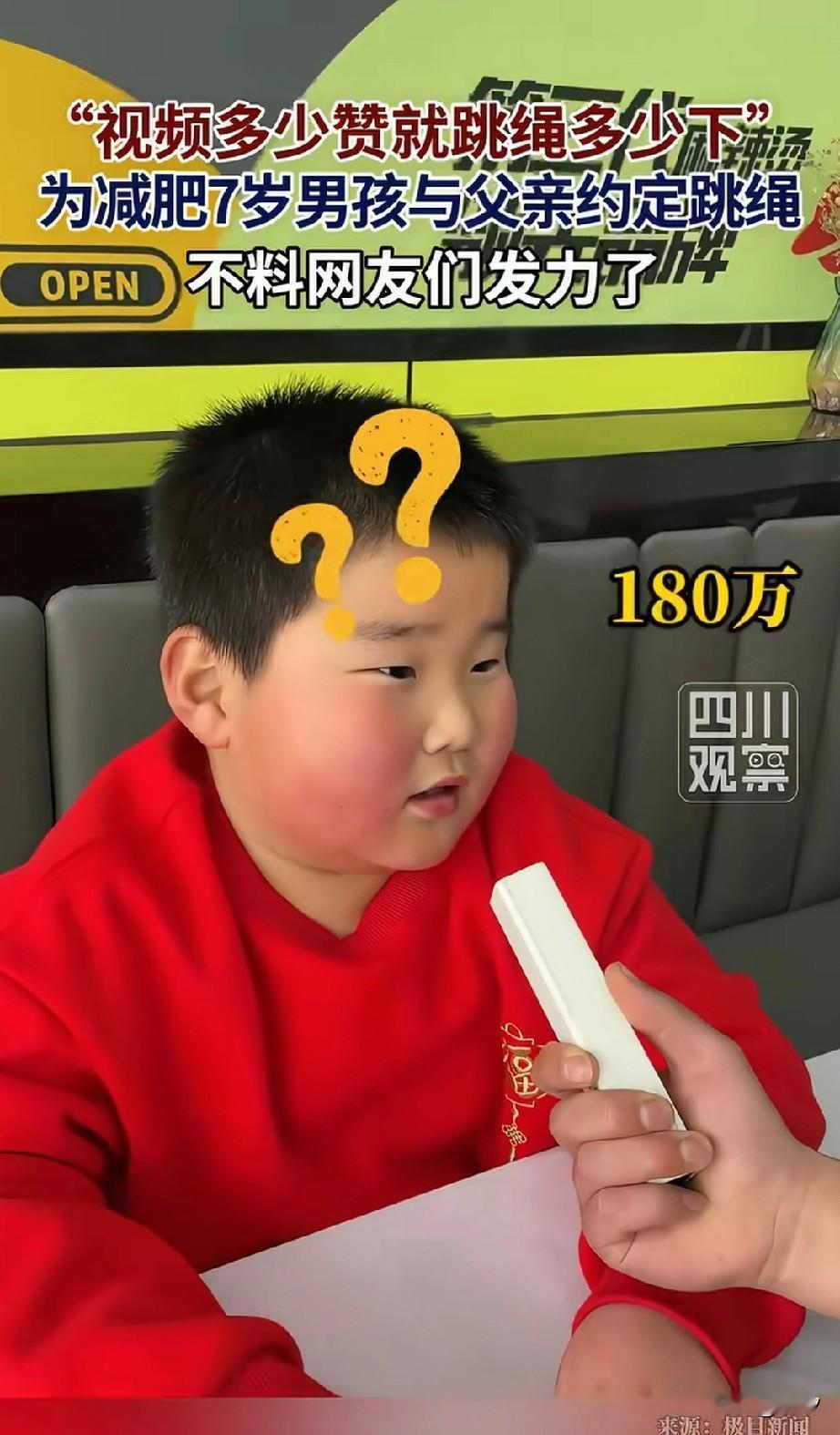 山东临沂的小胖火了, 因为他才7岁就很肥胖了, 他的爸爸为了督促他减肥, 就拿他录了视频, 放在网上看点赞量, 点赞量多少他就跳几下绳子, 本来也就几百点赞, 小胖还能应付的过来, 网友听说了这个规矩之后, 让他的视频播放量猛增, 当他的父亲告诉儿子, 这次的播放量是180万之后, 小胖整个人都僵在那儿了, 他不敢相信这个数字, 这不得把他累死, 这网友还真是给他找活, 他的父亲看着呆住的小胖, 告诉他不要害怕, 会把这180万点赞量分期付款, 分成几个阶段让儿子完成, 小胖这才回过神来, 这也太夸张了, 没想到一个减肥的监督视频, 居然能够有180万的点赞量, 网友还真是看热闹不嫌事大! 大家觉得小胖能够完成吗? 奋进新山东 憨厚小胖 山东青岛小胖 潍坊小胖
