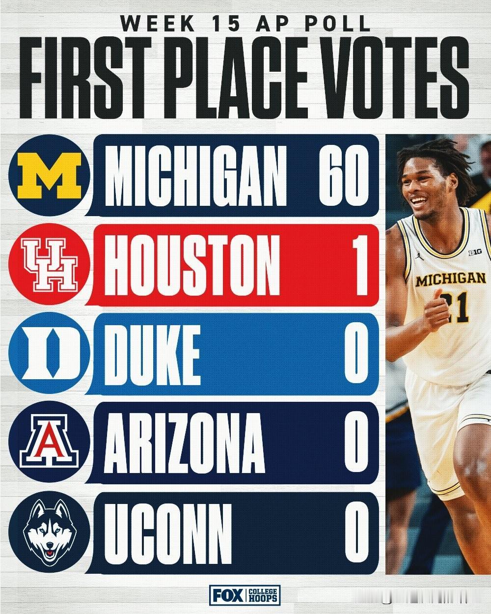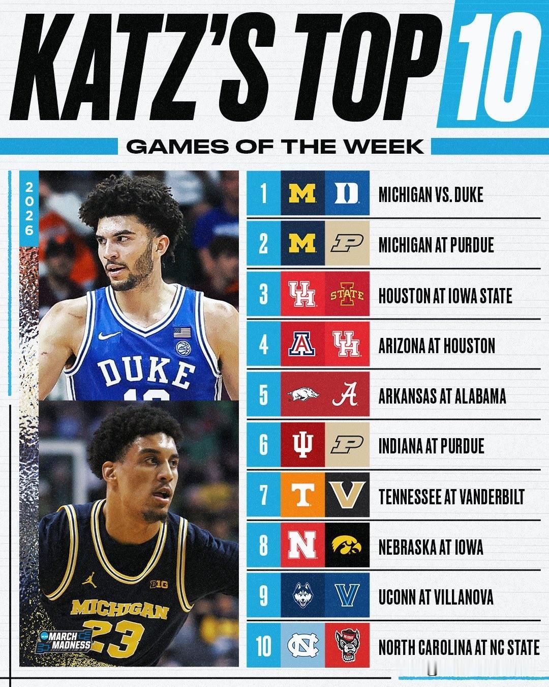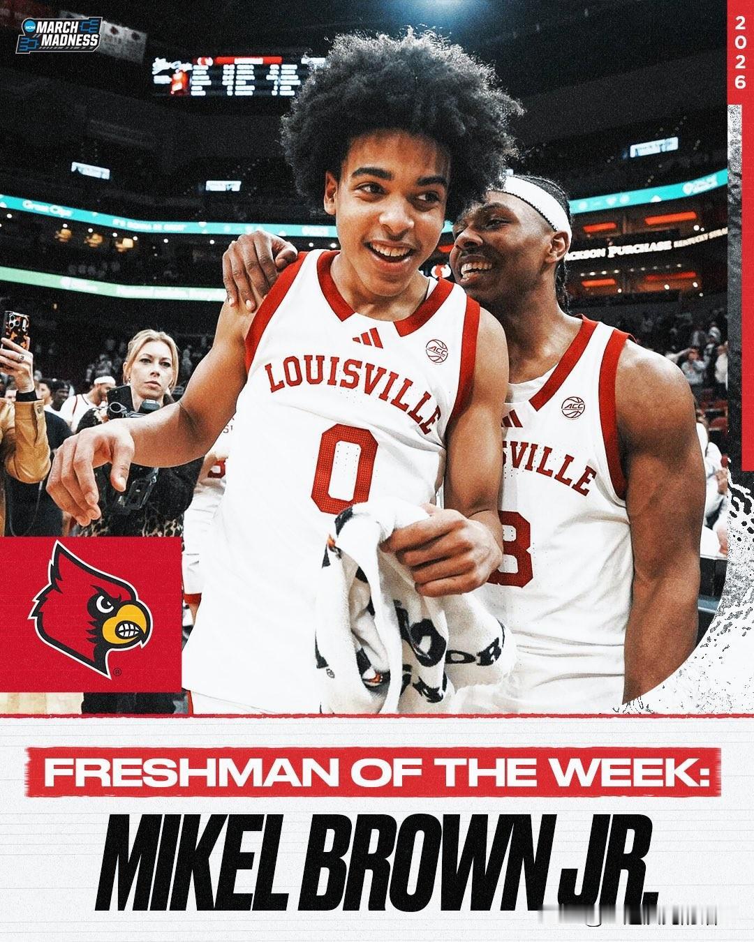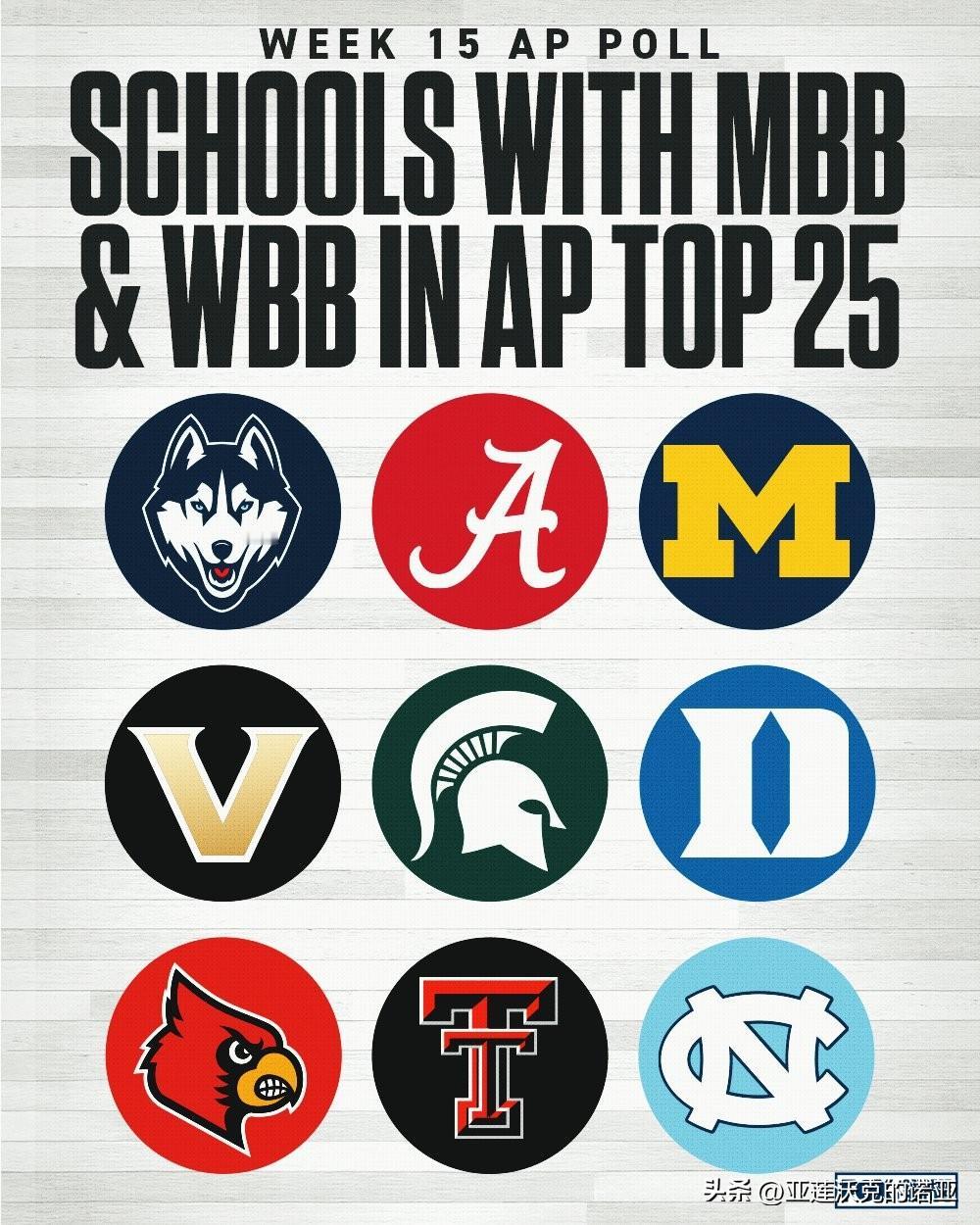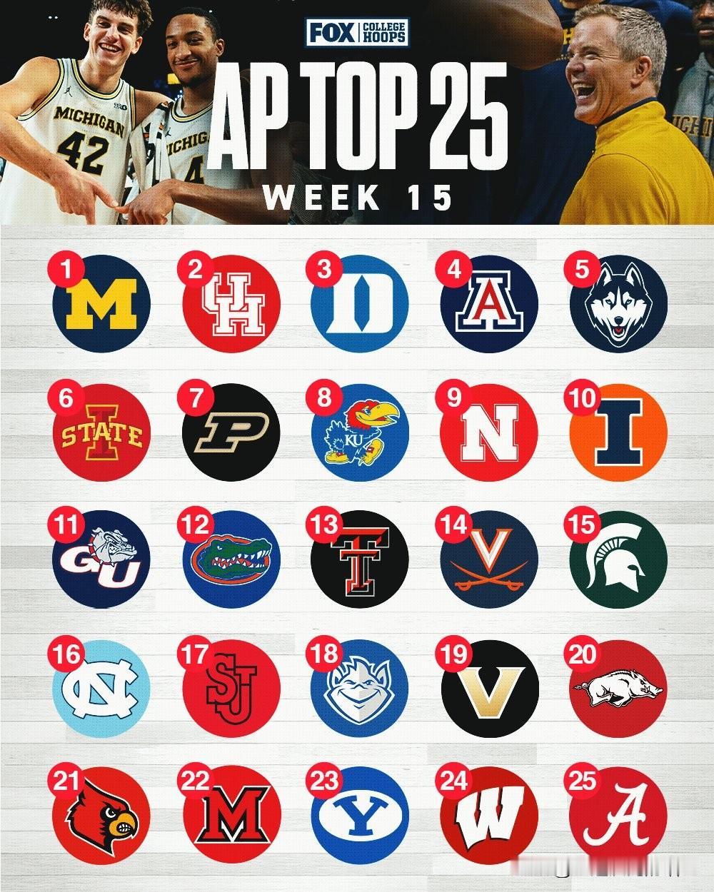 美联社公布第十五周前25强榜单,密歇根大学登顶全美第一的位置,亚利桑那大学遭遇两连败跌至第四位,官网评选的上周最佳球队是威斯康辛大学,最佳球员是德州理工JT Toppin,2026年nba选秀 最佳新人是路易维尔控卫Mikel Brown Jr。