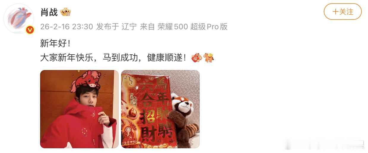 【肖战给大家拜年啦】肖战祝大家马到成功健康顺遂除夕夜,演员发文并分享自己的新春照