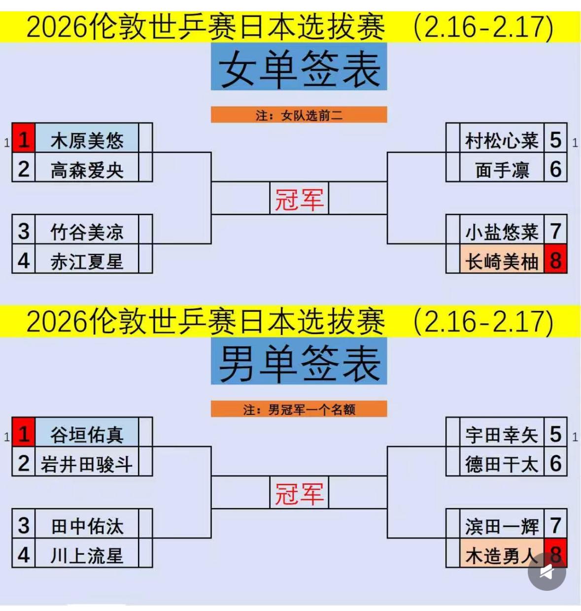 2026伦敦世乒赛日乒选拔赛第二阶段签表出炉长崎美柚 宇田幸矢有望成为世乒赛成员! 经过2月16日一天的小组赛, 17日,日乒伦敦世乒赛团体第五人 的选拔进入淘汰赛阶段! 木原美悠与长崎美柚在 上下半区, 顺利的话,决赛相遇! 男线方面, 宇田幸矢与去年U19世青赛 男单冠军川上流星在上下半区, 顺利的话, 也是决赛阶段相遇! 日乒的竞争越来越激烈, 也在实实在在选拔优秀人才, 做到公平公正, 由各个方面进行监督选拔, 没有做签!