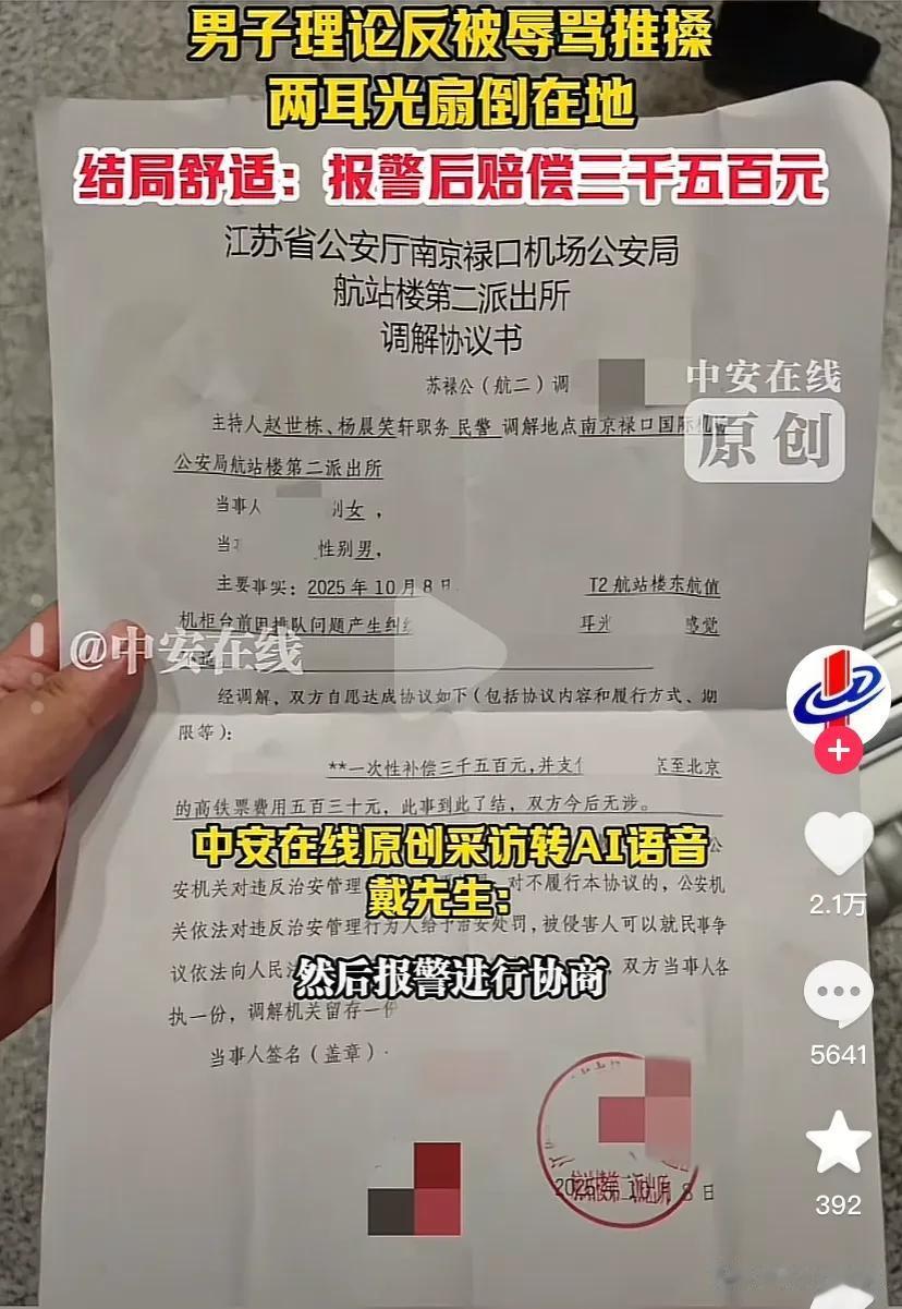 见对方态度还算诚恳,并且女子又在哭喊卖穷,戴先生就原谅了他们,签了谅解协议书,打人者赔偿戴先生3500元,并支付戴先生的南京到北京的高铁票费用。