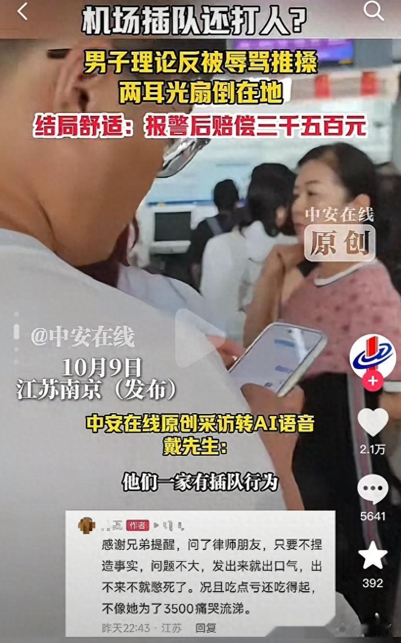 事情发生在10月8日,南京禄口机场,值机柜台前戴先生和其他旅客们正在排队,突然有几个人站到戴先生旁边,准备在戴先生前边插队。