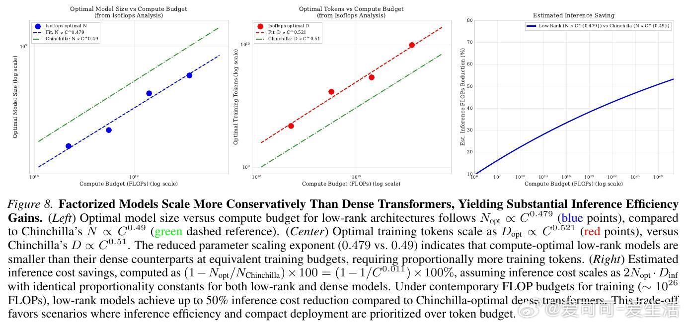 这意味着,我们可以用更少的参数量实现相同的性能。例如,一个 4.5 亿参数的低秩模型,通过更长时间的训练,可以达到 7.8 亿参数稠密模型的水平。这为“推理优化”提供了全新的思路:在训练阶段多花一点时间,换取推理阶段巨大的参数量缩减。