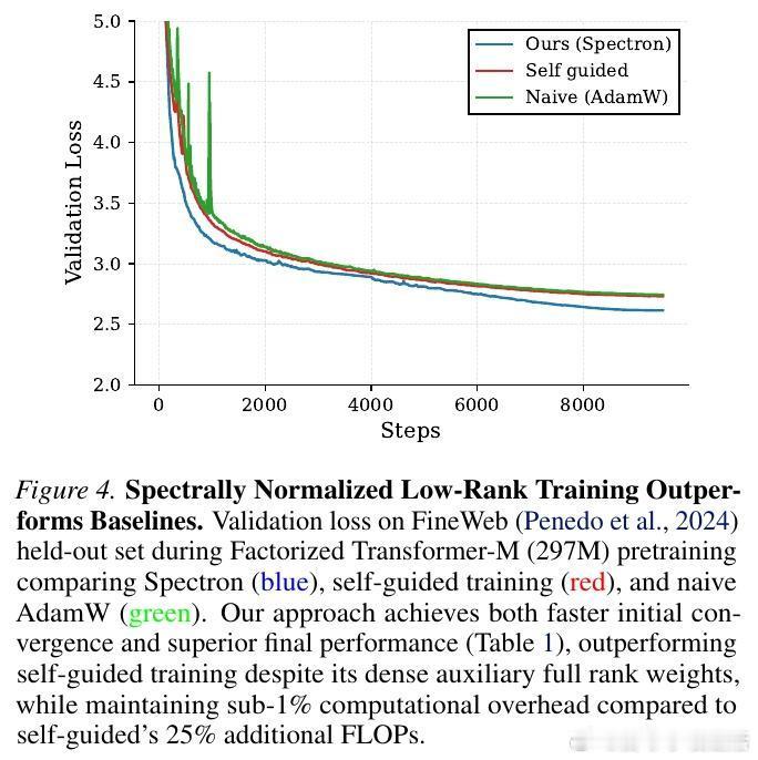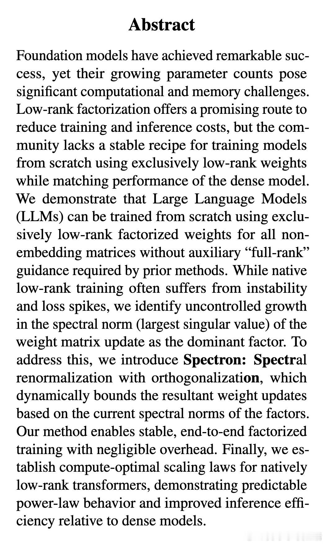 总结:- 智能的本质或许不在于参数的冗余,而在于结构的精炼。- Spectron 证明了:给更新套上“谱”的枷锁,才能换来训练的自由。- 低秩训练不是对性能的妥协,而是对推理效率的预支。