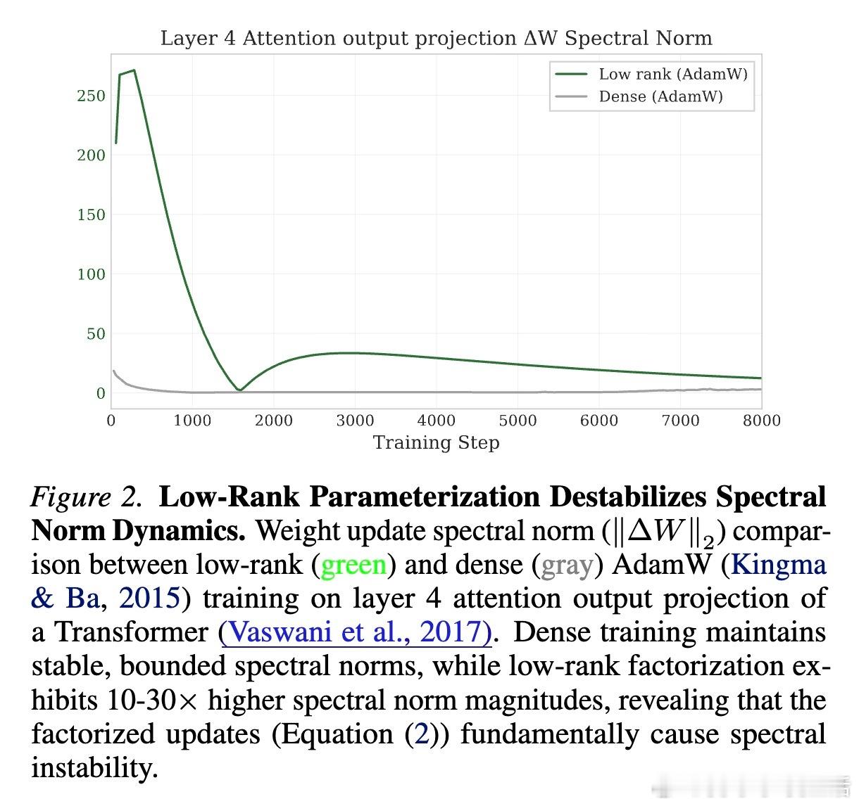 传统的低秩参数化(W = AB)在训练初期极度不稳定,经常出现损失函数激增(Loss Spikes)。研究团队发现,问题的根源在于“谱范数爆炸”。