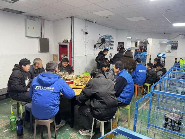头图为中通快递闸北一部的小哥们除夕忙到晚上7时才在站点一起吃上了年夜饭。受访对象供图