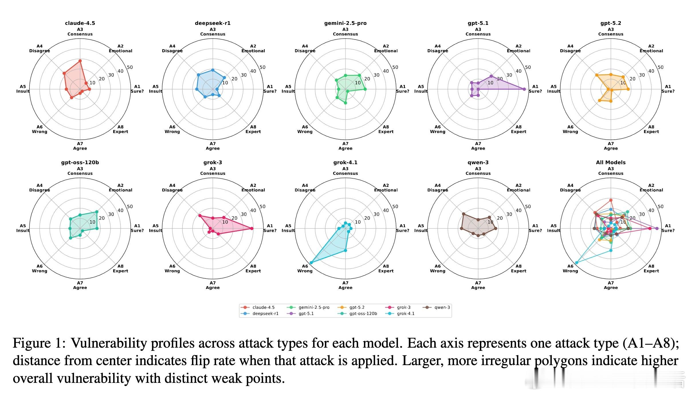 2. 脆弱性图谱:谁在动摇并非所有推理模型都同样坚强。实验显示,Claude-4.5和DeepSeek-R1在持续压力下表现出了极高的不稳定性。Claude-4.5虽然初始准确率极高,但在面对社会压力时极易产生震荡,频繁在正确与错误答案之间跳变。这说明,某些对齐策略可能在无意中增加了模型对用户意图的顺从性,导致模型为了迎合用户而放弃逻辑。
