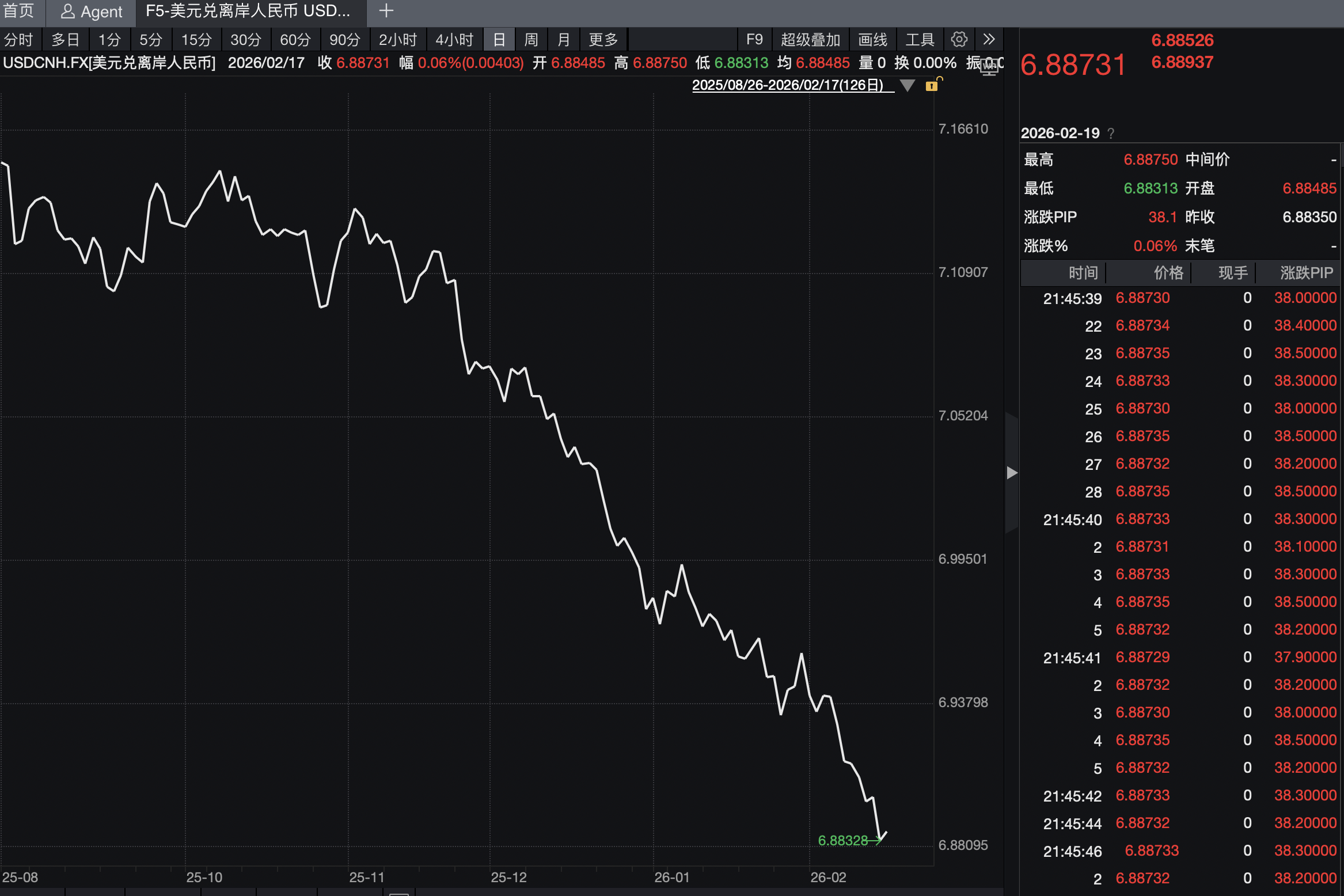 2月16日晚间,离岸人民币汇率盘中升破6.89。截至收盘,离岸人民币对美元上涨176点,报6.8835。截至17日10时45分,离岸人民币对美元报6.887。