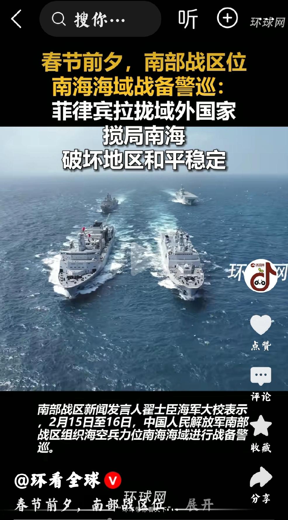 2月17日,央视新闻报道:春节前夕,南部战区,南海海域战备警巡,菲律宾拉拢域外国家,搅局南海,破坏地区和平稳定。 个人认为:我们没有忘记解放军守卫国家,同时没有忘记南海问题始终是这几个恶意捣乱的小国家。 要想解决南海这个问题,只有让这几个小国家国力崩溃,处于有心无力的状态。才能彻底解决,南海问题。