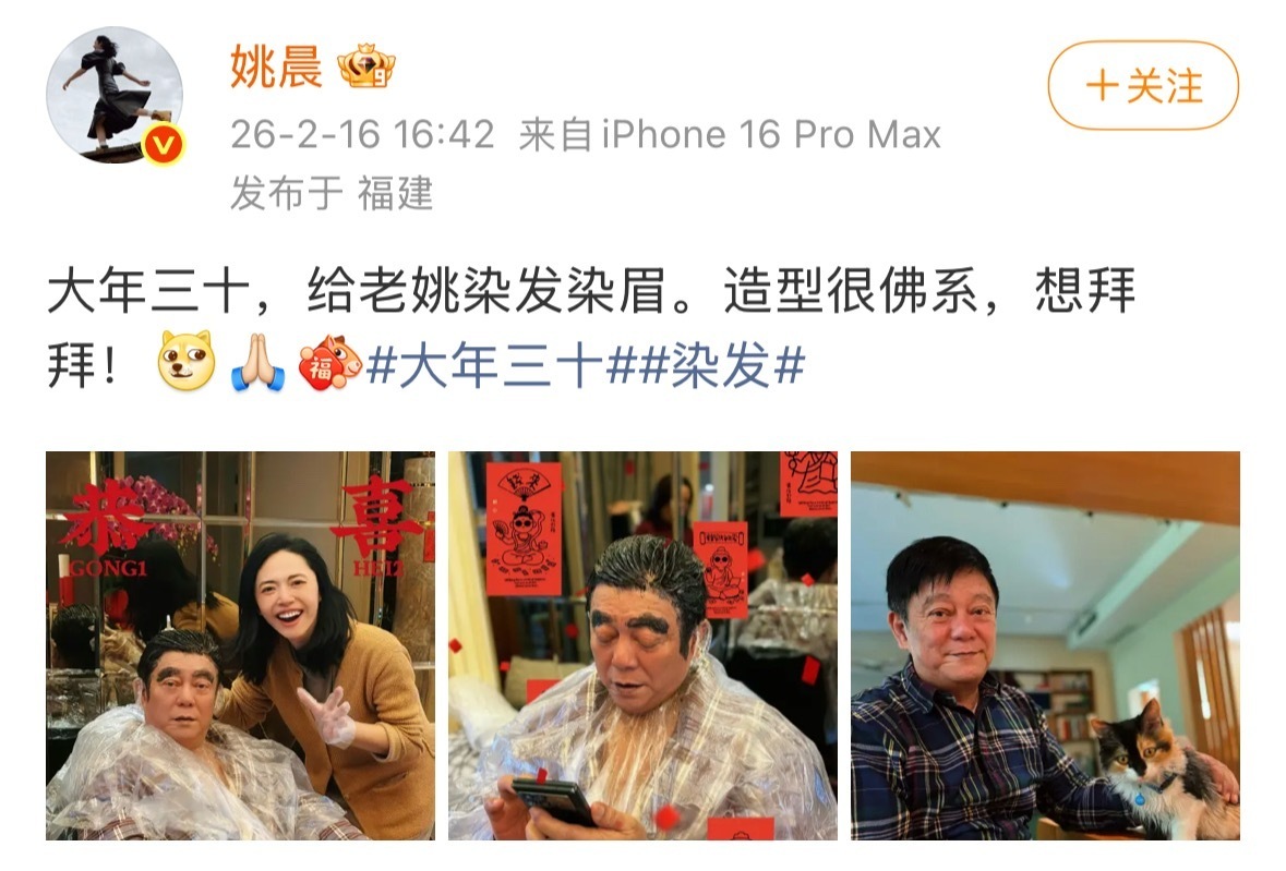 姚晨除夕给爸爸染发染眉姚晨回福建老家过年了姚晨除夕给爸爸染头发染眉毛,这效果真的