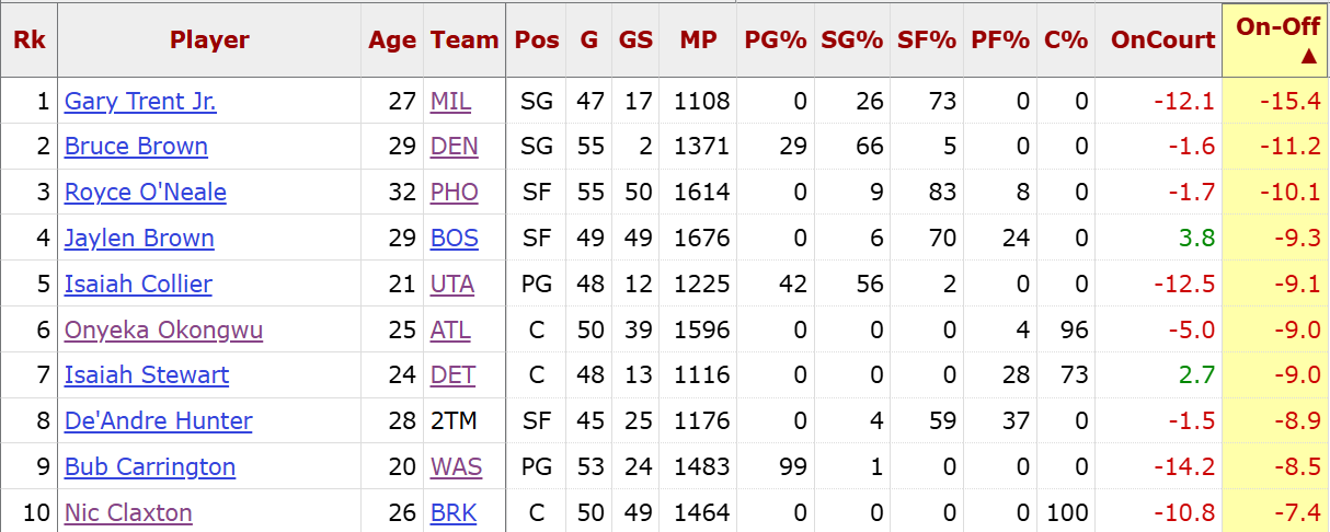 虎扑02月17日讯数据媒体BasketballReference列出了本赛季上半程联盟各名球员的on-off值(在场与离场百回合正负值的差值),雄鹿球员加里-特伦特位居倒数第一。