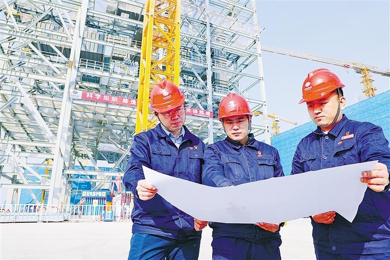 图为工程人员现场核验施工设计图纸。本报记者刘向摄
