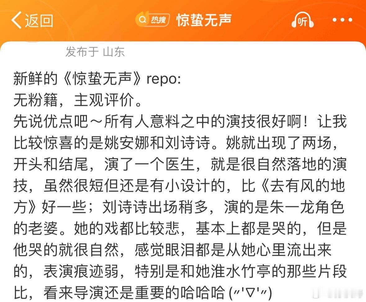 刘诗诗大屏对我眼睛特别友好路人看完惊蛰无声完全被刘诗诗大屏上的美貌征服了!说小玉一出场就美得眼前一亮,怪不得一姐长红多年,这种原生美貌就是经得住大荧幕考验!看repo说刘诗诗出场不多,但她的戏都比较悲,因此基本上都是哭的,一姐的哭戏情绪很好,让人很容易代入进去🥹而且妆容淡淡的,越素越美丽!温柔又带着破碎感和清冷气质,完全就是白月光本光的存在了🥰