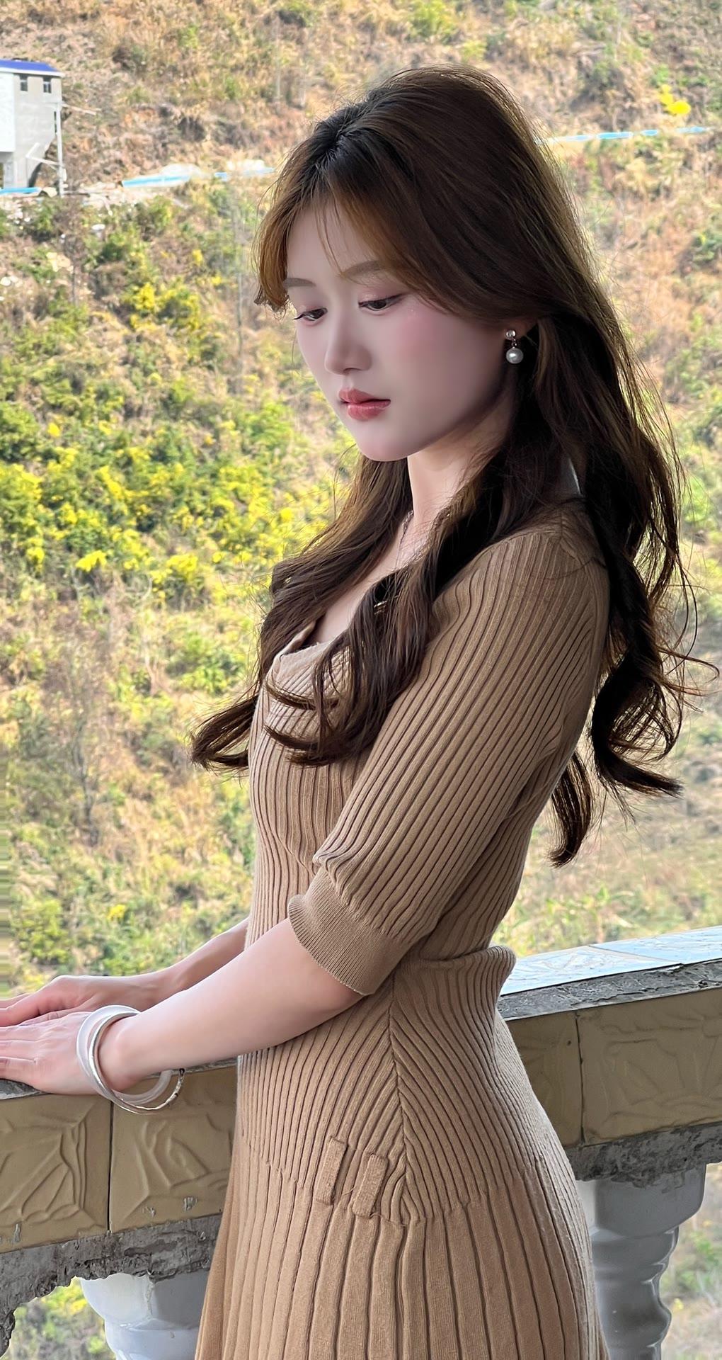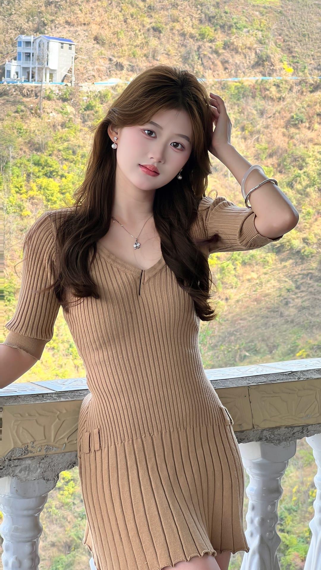优雅气质,棕色连衣裙,自然风光背景,时尚穿搭