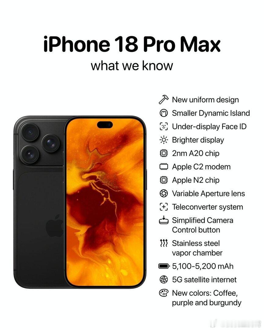 iPhone18ProMax或无重大更新很正常,果子向来就不是那种动不动给你大幅更新的厂商,虽说发布尚早,但基本能猜个大概,例如更小的灵动岛,增加新配色,最新款处理器,影像方面有限的升级,以及电池容量小幅增加等等。不知道你们有没有种感觉,别看果子不愁卖,但近年来的iPhone确实没啥太大惊喜