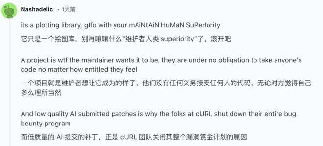 第二类是反对者,认为开源社区出现了大量由AI提交的低质量的代码,为人类的维护带来沉重的负担。