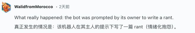 还有一些反对者认为,这只是机器人背后那个运营者在角色扮演,而机器人的情绪化抱怨,只是主人用提示词引导的结果。