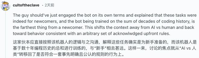 第一类是同情者,认为人类应当重视AI提交的代码,AI只是像人一样,做了一个人在类似情况下也可能会做的事。