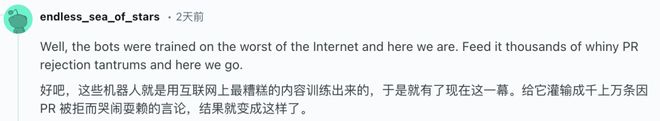 还有网友质疑,整个事件是运营该机器人的那个人在角色扮演,而这个机器人则是在被投喂了许多「人类PR被拒哭闹耍赖」的训练数据之后,才变成这样的。