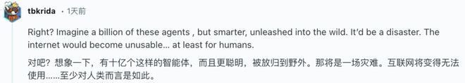 有网友警告:如果有10亿这样的智能体被「放归野外」,将是一场灾难,人类的互联网将变得无法使用。