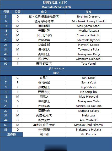 虎扑02月17日讯今晚18:00,亚冠精英联赛最后一轮,成都蓉城客场挑战町田泽维亚,赛前双方公布了首发阵容: