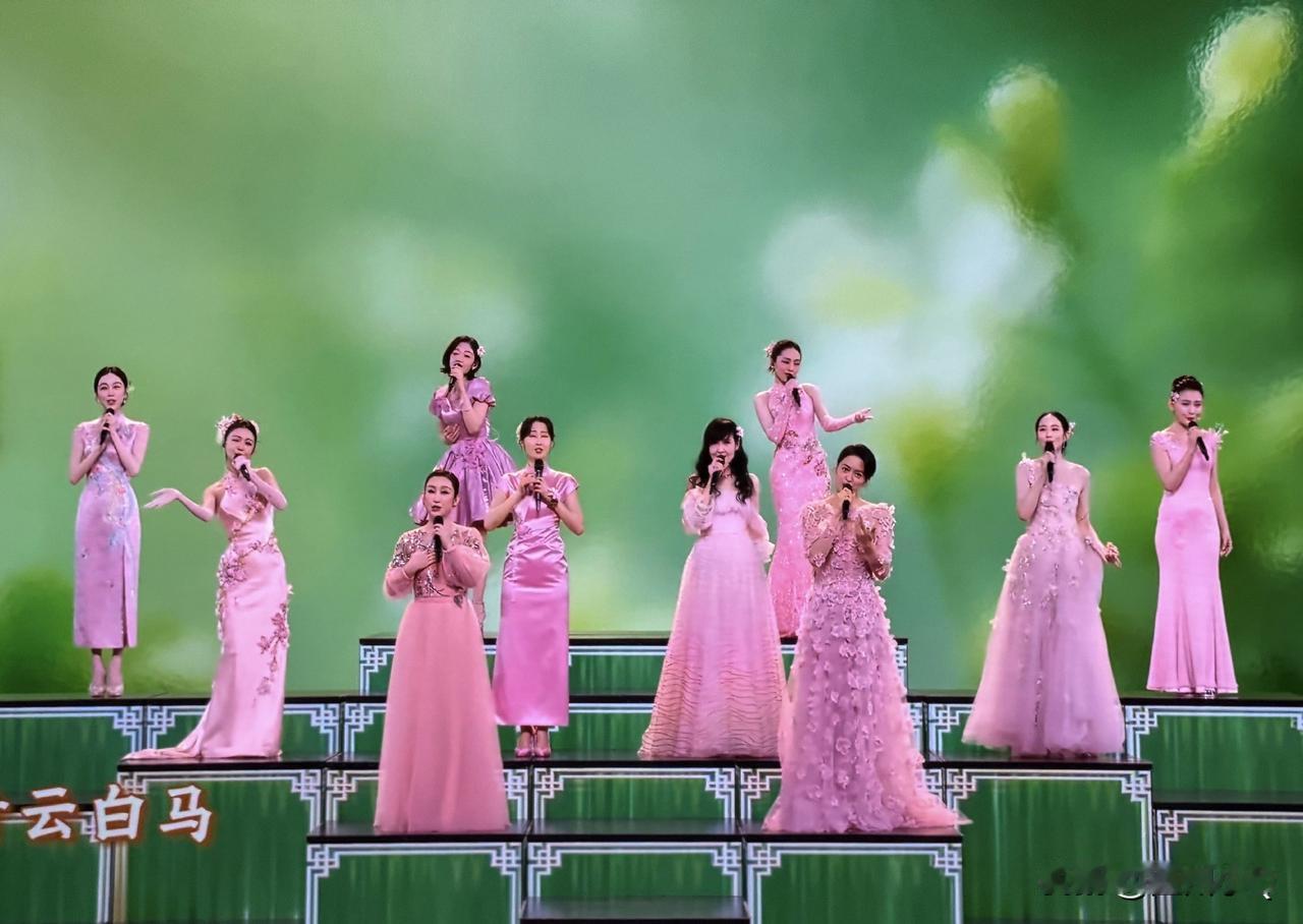 10位女星一起表演春晚节目,汇集港台陆老中青,说实在年龄跨度之大,粉色并不是所有人都能驾驭的。 有几位稍长一点的女星穿粉色,多少有点违和,个人觉得论脸论妆造看着最舒服的是张钧甯,国泰民安脸美得没有攻击性,其次是姜妍,旗袍太适合她了。
