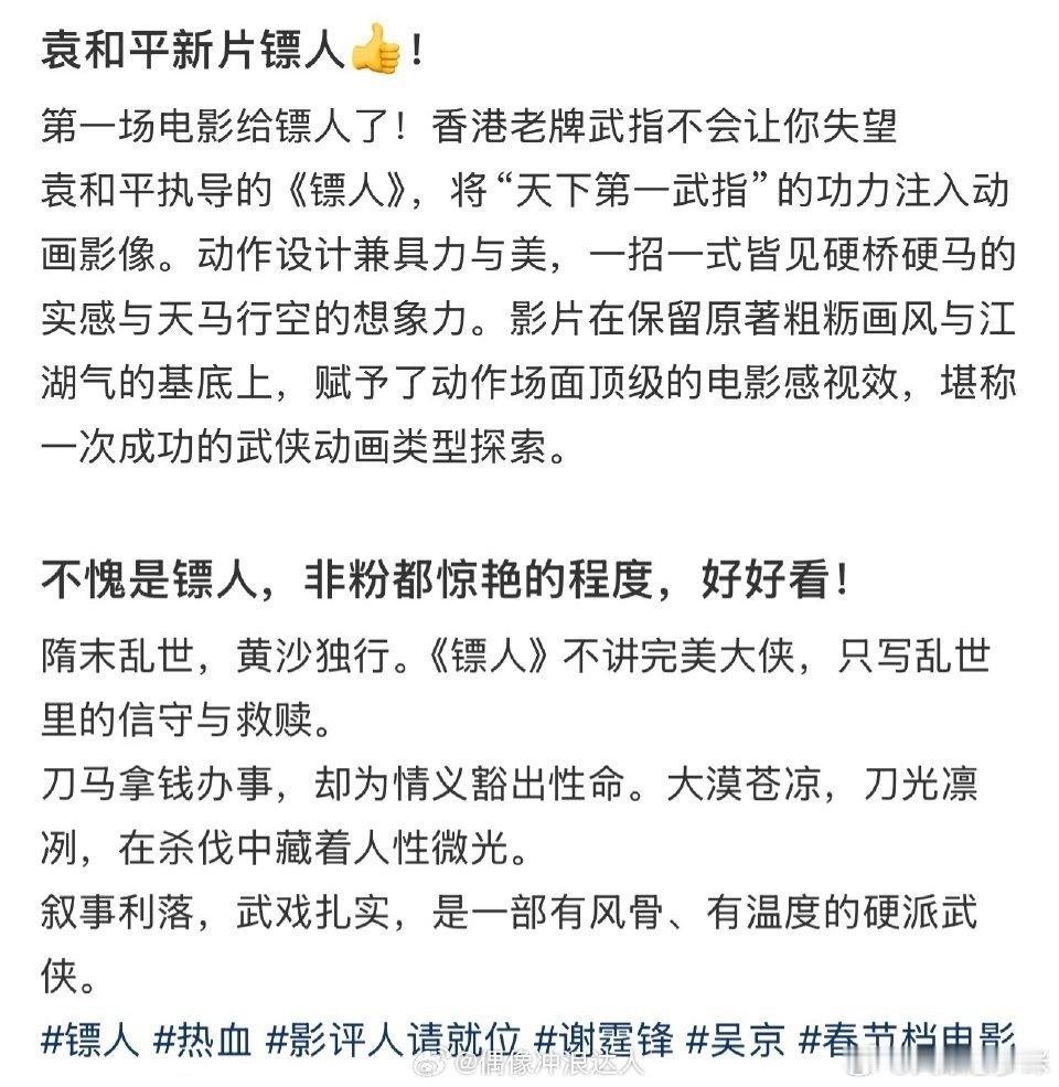 镖人第一波反馈观众称镖人远超预期 终于等到正宗武侠片,镖人打戏流畅实景震撼,不愧是春节档必看