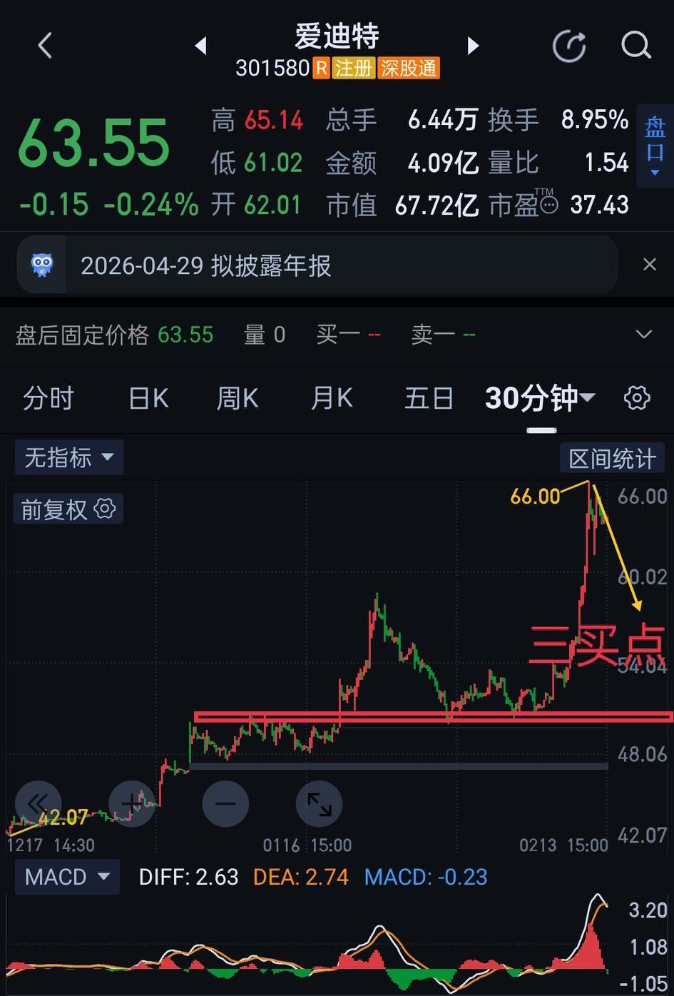 用缠论分析个股"爱迪特"走势结构,节后如果不能有效站稳65.15,从高点66可能导致三十分钟一笔下形成,如果该笔下止步于图〈2〉五分钟中枢上方,将形成该中枢的三买结构。该股后期涨幅尚不明确,只是当做理解缠论结构的特例观察。