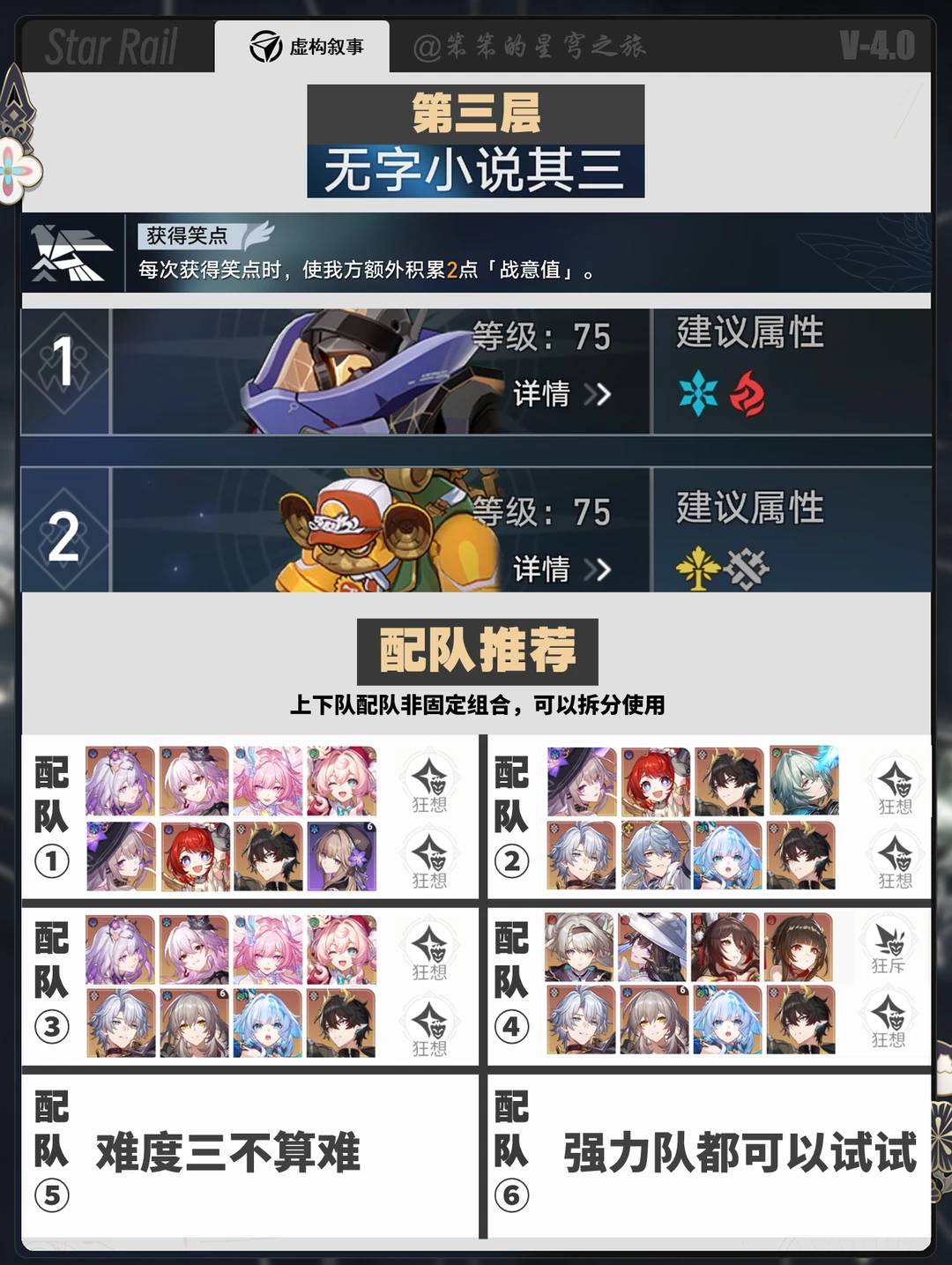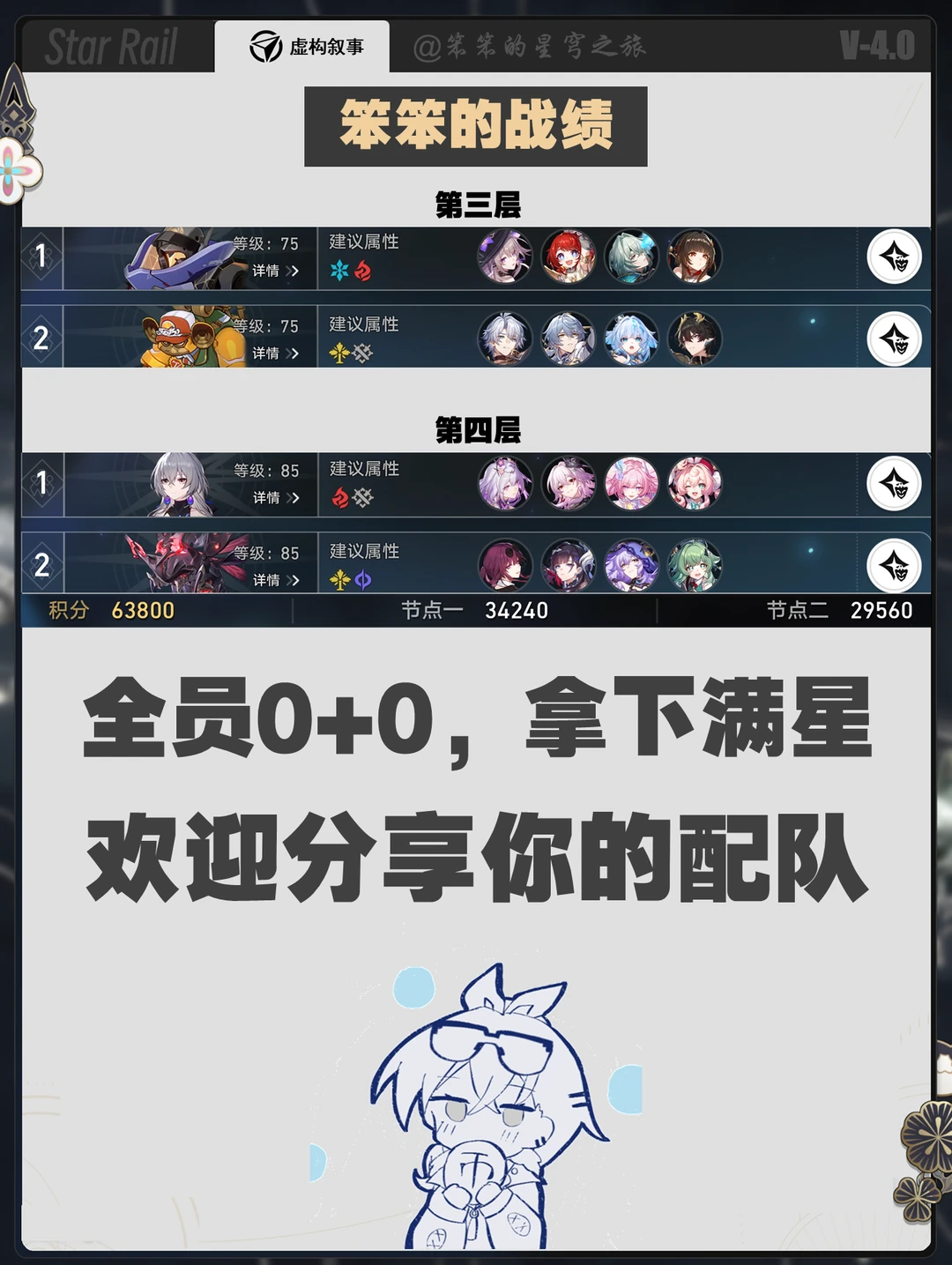 🐱大家好,我是笨笨的铲屎官 新的一期虚构叙事上线了 这一期有欢愉、普攻战技、击破的环境 因为欢愉主C火花还未上线 所以可以用流萤击破队、遐蝶、 白厄、大黑塔、dot等队伍 第四层还是有一定难度的 笨笨0+0的队伍试了 白厄、遐蝶、大黑塔、dot 目前就上半记忆战舰、下半dot可以通关 白厄和大黑塔都只能大26000分 最后,你拿下满星了吗 看看你的配队