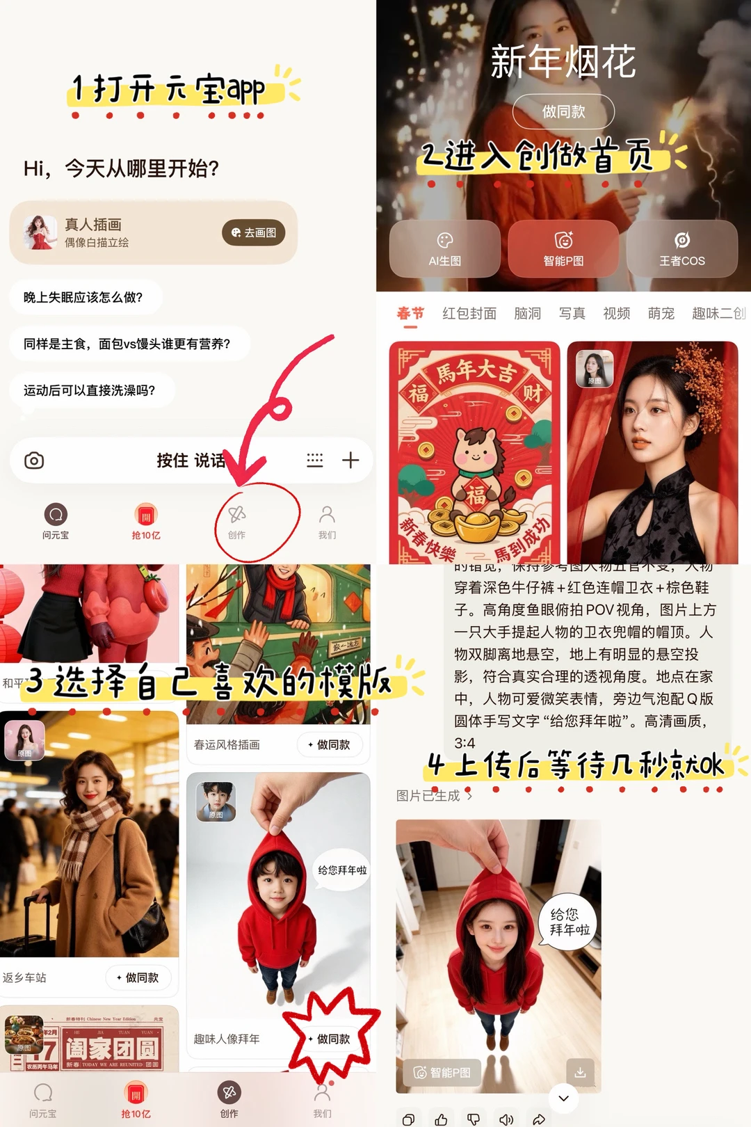 过年想拍美照又懒得收拾的宝宝,我发现元宝这个春节新功能太好用了,直接拯救我!不用P图不用找场景,上传照片就像换了套新造型,太方便了~[自拍R] 关键是操作巨简单,不用自己打复杂口令: 创作tab → 春节模板 → 选风格 → 上传照片,元宝直接生成! 从模板选择到生成预览,全程流畅又好上手~ 新年想轻松换新装、拍出氛围感大片的姐妹,快锁死元宝这个玩法🔒