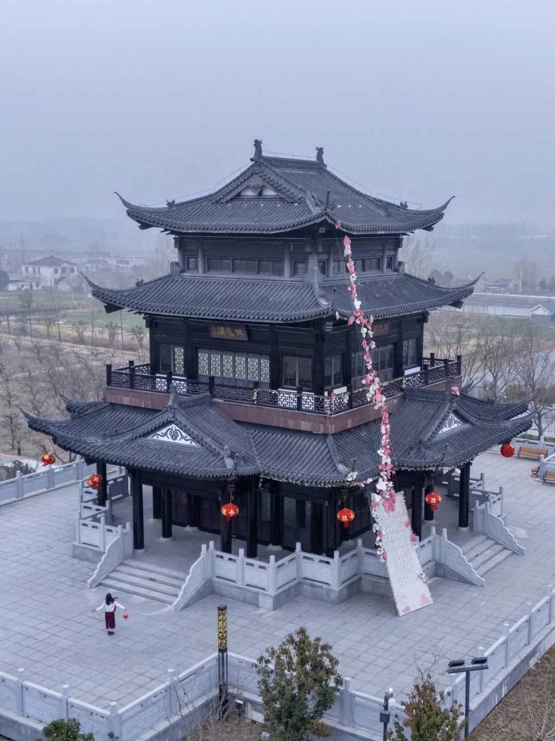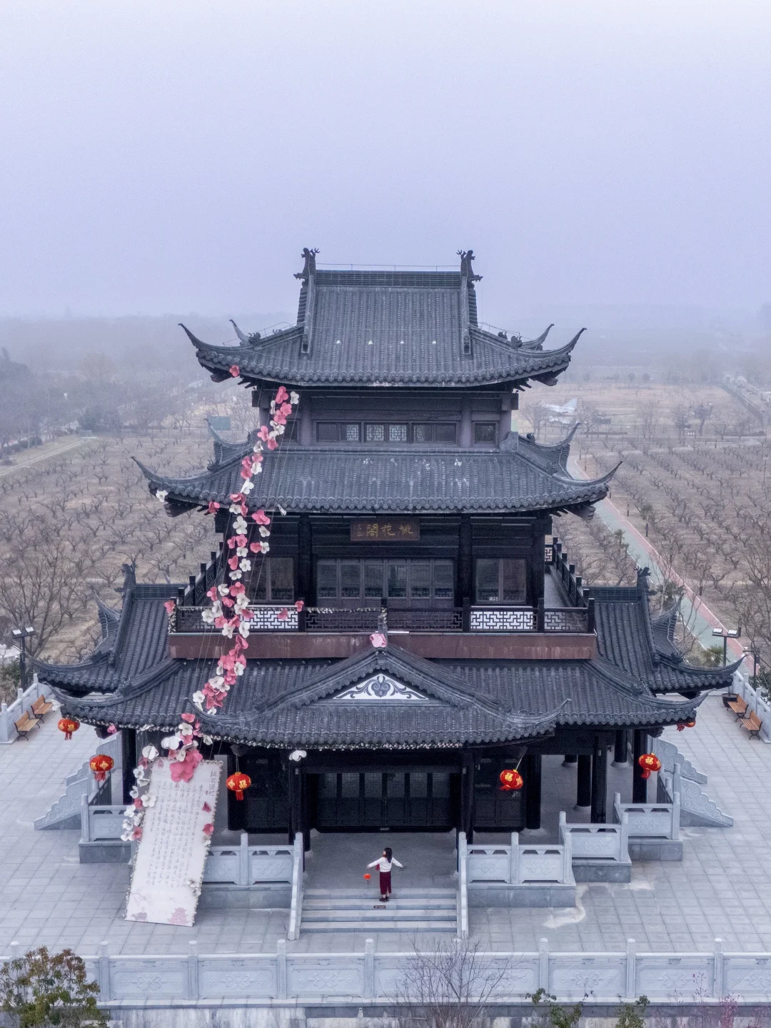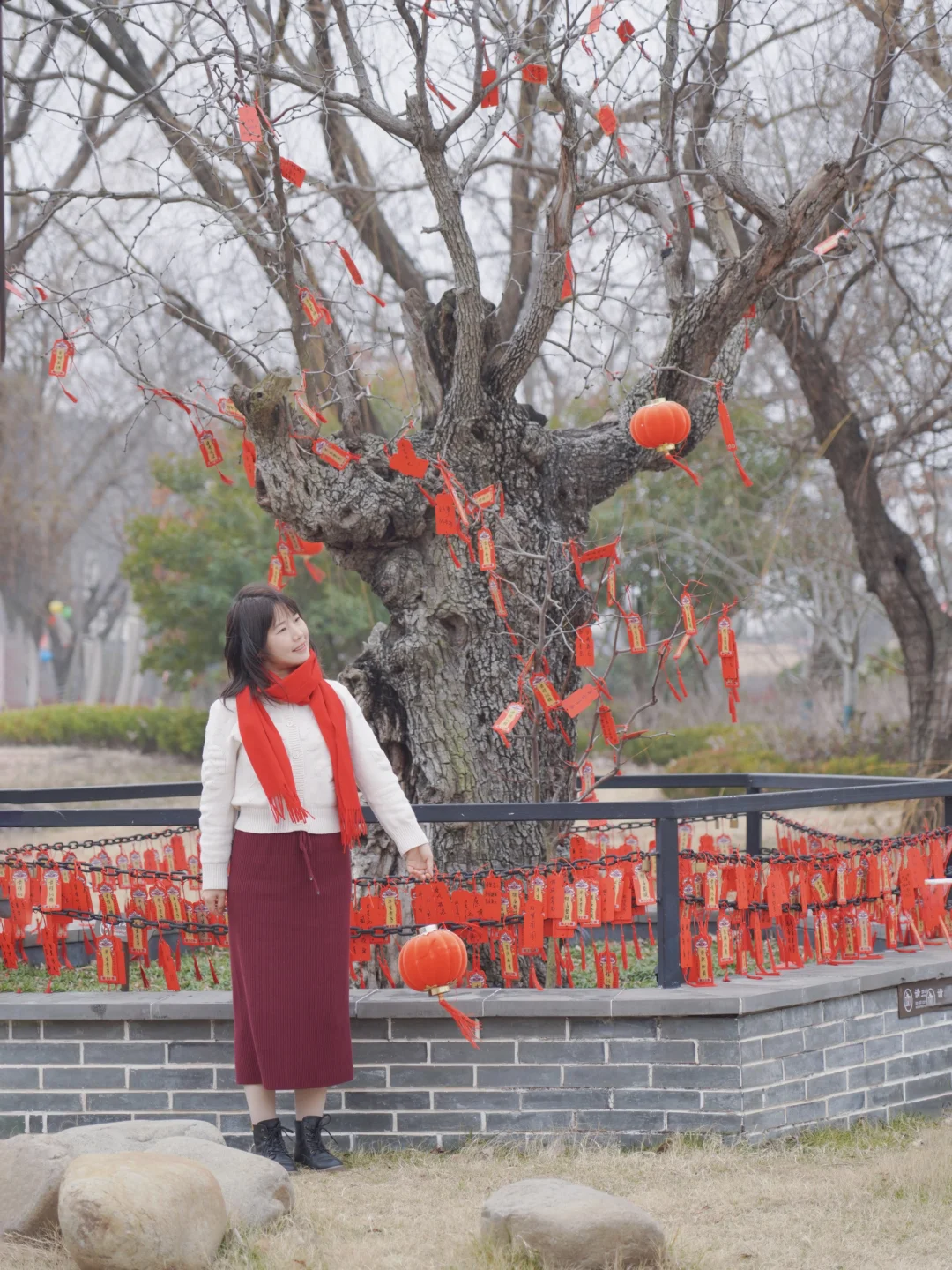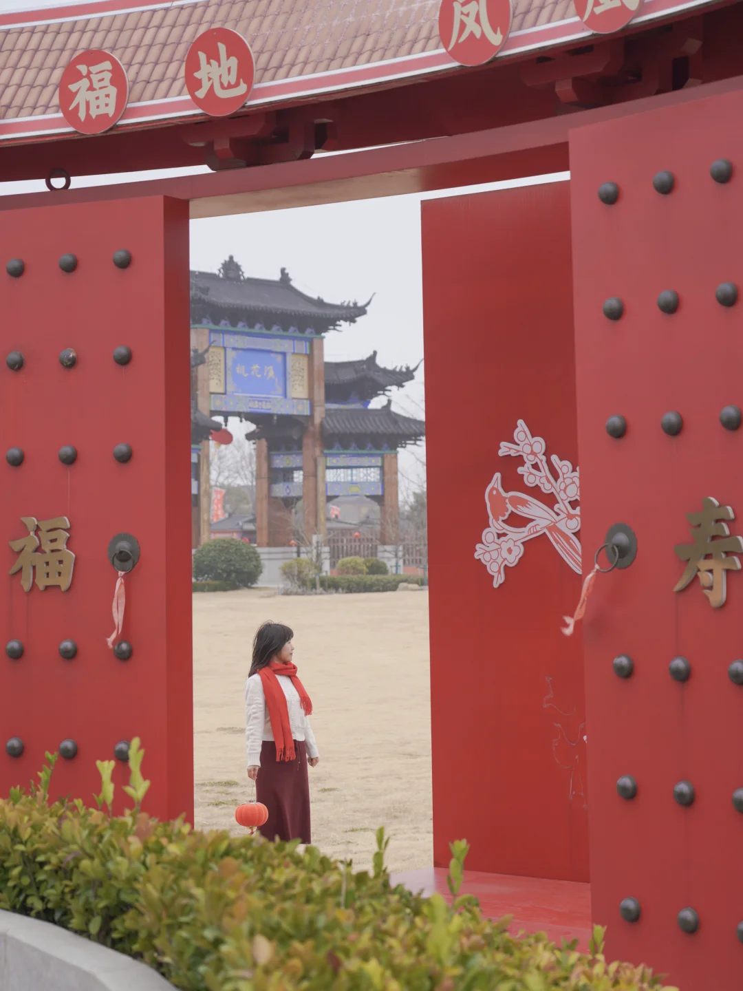 踏入景区,仿佛穿越回1400年前的龙冈古镇。这里曾是新四军三师七旅指挥所驻地;脚下是承载历史的沙地,眼前是连绵万亩的桃梨园,虽是冬日,梨树干却挂满了红灯笼与祈福牌,萧瑟中透着喜庆[福R]