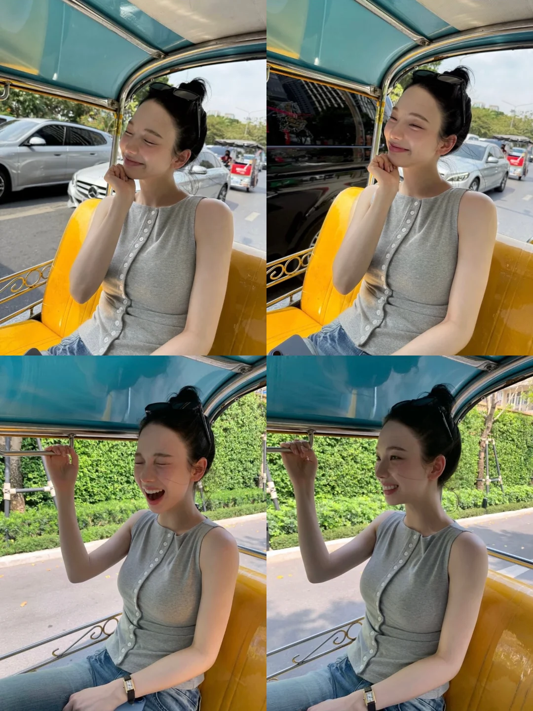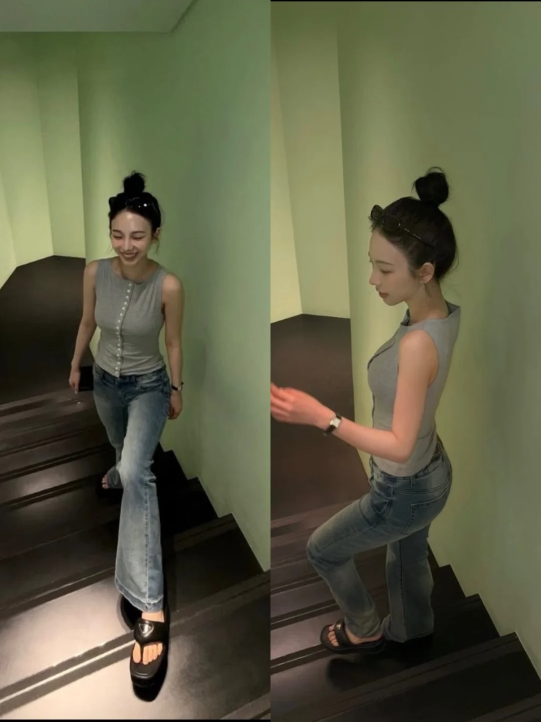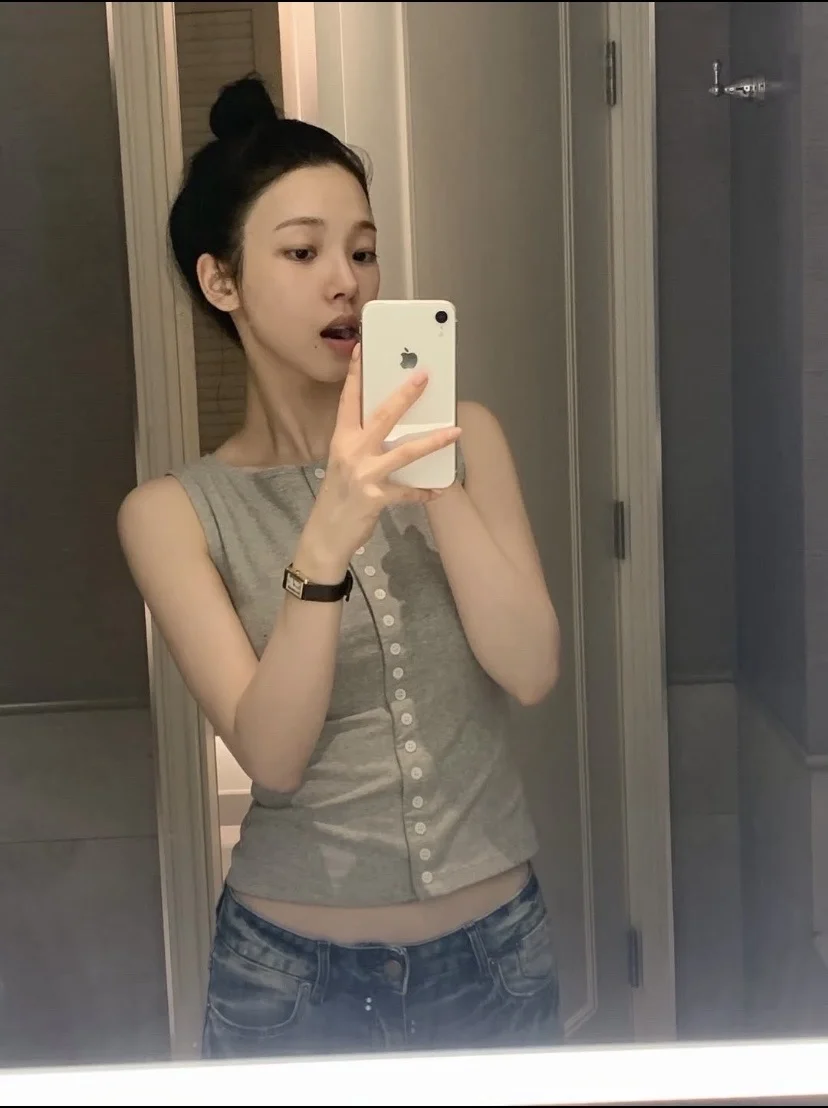 柳智敏这一身真的把美式复古风焊在身上了✨ 浅灰色排扣背心+低腰微喇牛仔裤,甜辣又随性,完全是美式校园女主既视感! 发型搞个高丸子头,再把墨镜架在头顶,氛围感瞬间到位!日常出街、约会都超合适,轻松get明星同款松弛感