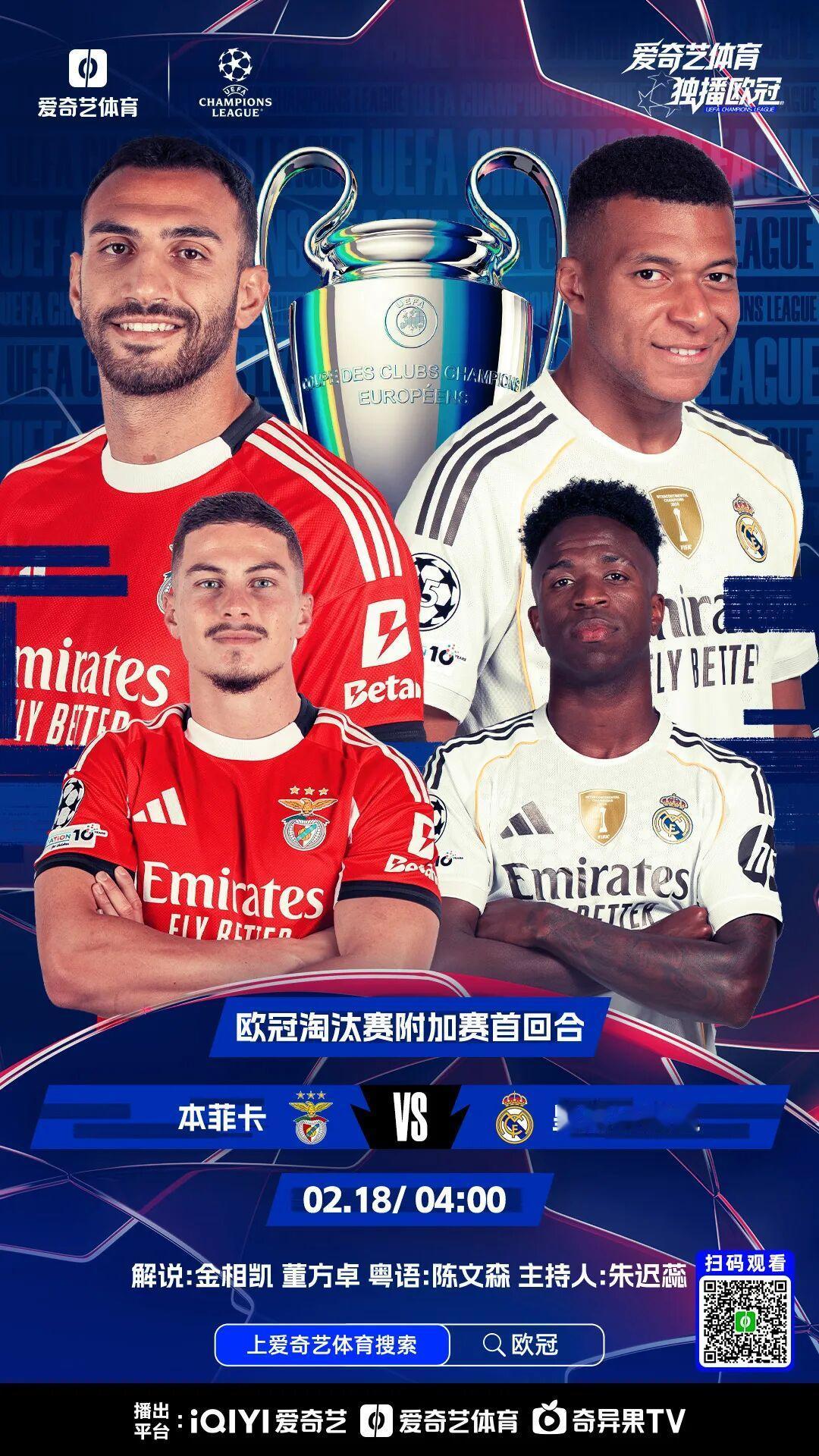 预告2026马年初二凌晨欧冠淘汰赛附加赛首回合比赛 集卡领红包 在2026马年初二凌晨将迎来晋级欧冠16强淘汰赛附加赛首回合比赛。4场晋级欧冠16强淘汰赛附加赛首回合比赛,转播平台:爱奇艺体育。 晋级欧冠16强淘汰赛附加赛首回合比赛如下: 2月18日01:45 加拉塔萨雷(土耳其)vs尤文图斯,尤文图斯能否在客场抵挡住加拉塔萨雷进攻,成为尤文图斯取胜关键因素。 2月18日04:00 本菲卡vs皇家马德里,穆里尼奥率队本菲卡队将在主场继续迎战旧主目前在西甲联赛领头羊皇家马德里队,延续欧冠联赛恩怨。比赛看点:皇马能否在欧冠淘汰赛附加赛首回合比赛占得优势。皇马将在欧冠淘汰赛附加赛首回合比赛中客场对阵本菲卡,皇马公布了此役的球员名单。米利唐和贝林厄姆将因伤缺席本场比赛,阿森西奥和罗德里戈将均已以停赛也无法出席本场比赛。 2月18日04:00 摩纳哥vs巴黎圣曼耳曼,客场作战大巴黎迎来法甲联赛摩纳哥挑战,大巴黎在联赛中刚刚终结7连胜,以1:3不敌雷恩,法甲那边也有压力,现在双线作战,对于大巴黎还需要赶快调整。好在登贝莱连场进球状态不错。摩纳哥本赛季曾主场击败过巴黎,上轮他们3:1击败南特,近4轮保持不败状态还不错,但他们的欧冠肯定是难以突破,战意也很难说,又是1:6惨败给皇马之后。巴黎是最后战平纽卡斯尔,无缘直通淘汰赛,本场巴黎还是相比经验更丰富,此战有望反客为主。 2月18日04:00 多特蒙德vs亚特兰大,德甲联赛第2名多特蒙德将在主场迎战意甲联赛排名第6名亚特兰大队,预测多特蒙德将在首回合比赛中先拿下一场宝贵胜利,占据上风。