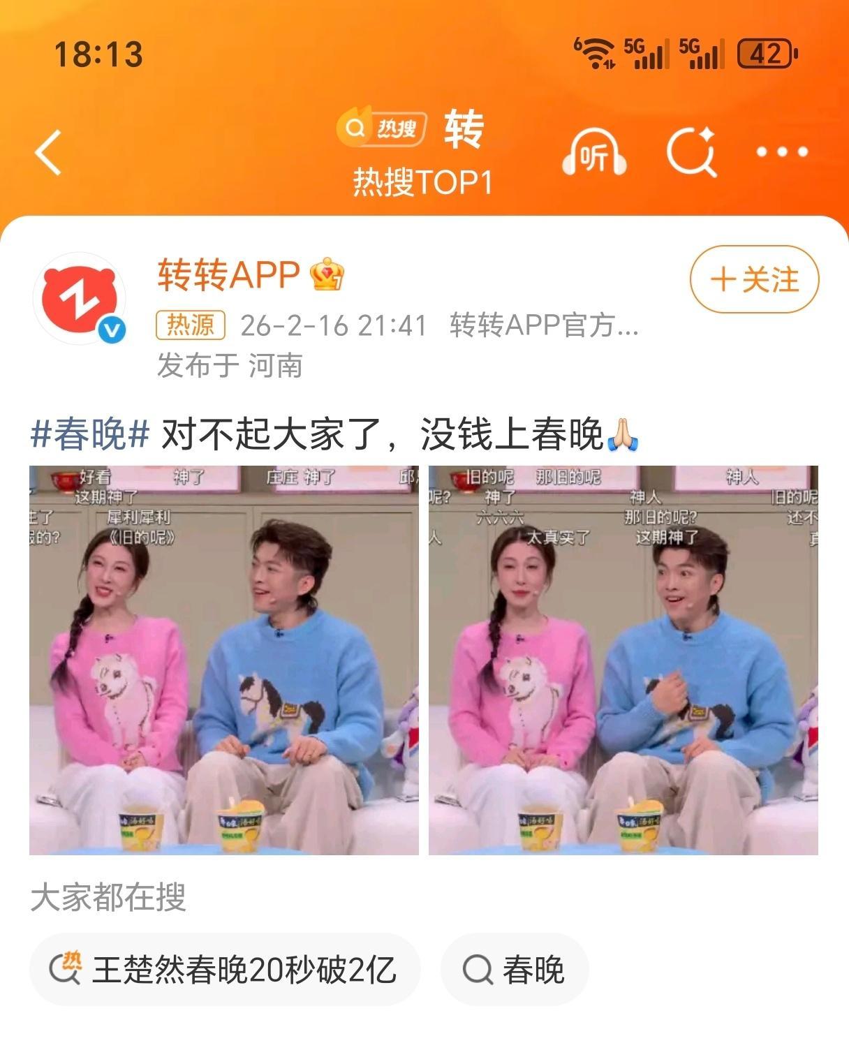 转转 对不起大家没钱上春晚今年转转没有上春晚打广告,上了一波热搜。豆包还添油加醋