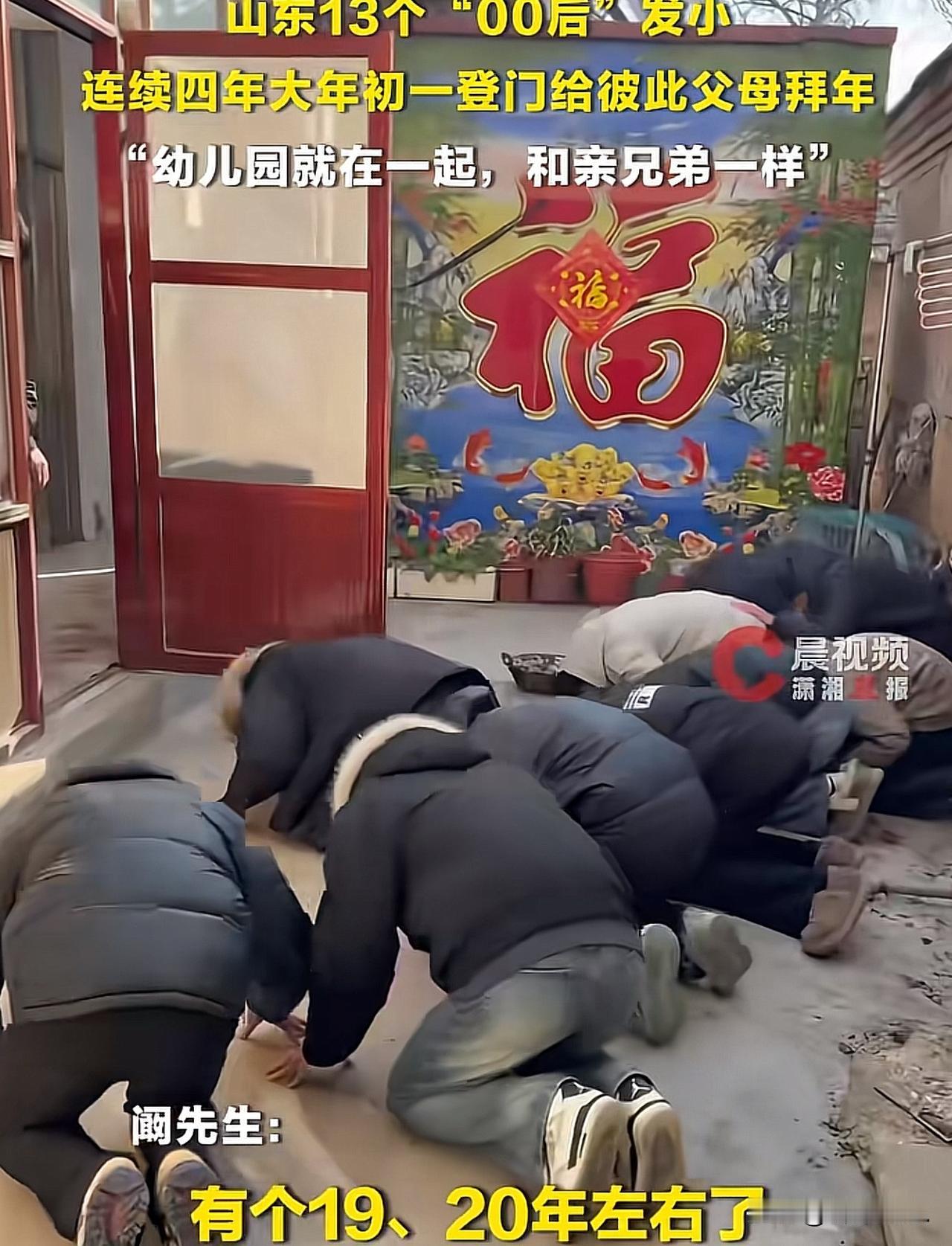山东,13个"00后"发小,登门给彼此的父母一起拜年的视频火了,他们称已经连续四年大年初一登门给彼此父母拜年,从幼儿园几人就在一起玩耍,和亲兄弟一样,约定要把这件事做一辈子。网友:无愧于孔孟之乡礼仪之邦的后代! 每年到了这个时候,大家都在说,现在的年味儿越来越淡了,亲戚走动少了,朋友联系疏了,小时候那种热热闹闹、真心实意的感觉,好像慢慢找不到了。 可就在今年大年初一,这一群年轻人,用最朴素、最真诚的样子,把我们心里最想念、最温暖的年味儿,完完整整地找了回来。 他们不是亲兄弟,却比亲兄弟还要亲。从幼儿园小小的年纪就挤在一起玩,一起跑、一起闹、一起长大,一晃眼就是快二十年的时光。 二十年是什么概念? 是从穿开裆裤的小不点,长成了顶天立地的小伙子;是从无忧无虑的孩童,变成了有人在上学、有人刚上班、有人在外奔波打拼的成年人。 生活把他们推向了不同的方向,可不管走多远,他们心里最惦记的,还是从小一起长大的这份情,还有彼此家里,看着他们长大的叔叔阿姨。 四年前,他们悄悄定下了一个约定:每年大年初一,谁都不能缺席,一起挨家挨户,去给彼此的父母登门拜年。 于是,每到新年第一天,天刚蒙蒙亮,这十几个小伙子就会准时出现,一群人热热闹闹地走在街头,一家一家地敲门,一家一家地问好。 没有什么隆重的排场,没有什么华丽的礼物,就是一张张年轻又真诚的脸,一句句踏踏实实的新年祝福,坐下来陪长辈聊聊天,说说话,把最实在的孝心和心意,亲手送到家门口。 有人在外地上学,放假第一时间往家赶;有人刚参加工作,再忙也把这一天空出来;有人奔波了一整年,可只要到了大年初一,一定会归队。 没有一个人找借口,没有一个人掉队,四年如一日,安安静静地坚持,认认真真地守护。 看着他们一群人站在一起的样子,真的特别戳心。现在的我们,常常忙着工作,忙着生活,忙着各种应酬,却很少再花时间,去认认真真见一面老朋友,去好好看望一下看着我们长大的长辈。 总觉得感情放在心里就好,总觉得以后还有机会,可这群00后用行动告诉我们:真正的情谊,从来不是挂在嘴边的客套话,而是日复一日、年复一年的用心和坚持。 他们把发小的爸妈,当成自己的爸妈;把彼此的家,当成自己的家。这种从小长到大、不掺任何杂质的感情,在这个快节奏的时代里,显得格外珍贵。 没有利益牵扯,没有人情世故,就是最简单、最纯粹的:你陪我长大,我敬你父母,我们一辈子不散。 很多人看完都忍不住感叹,这才是过年最该有的样子,这才是年轻人最该有的模样。 年味儿从来不是鞭炮有多响,饭菜有多丰盛,礼物有多贵重,而是人心靠得近,感情真,有人惦记,有人奔赴,有人把一句约定,认认真真守了一年又一年。 最好的友情,是历经岁月不散;最浓的年味,是人心始终温暖。 这13个山东小伙子,用四年的坚持,给这个新年添上了最温柔、最动人的一笔。 真心希望,这份干净又珍贵的情谊,能一直这样走下去。 一年又一年,一群人,一条心,一辈子,不分开。也愿我们每个人,都能拥有这样的朋友,都能守住这样温暖的人间真情。 欢迎关注@解豸说法.
